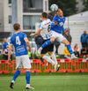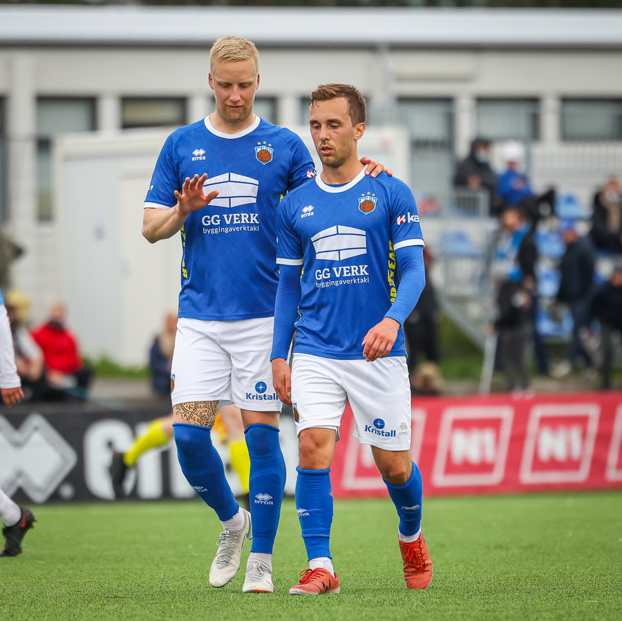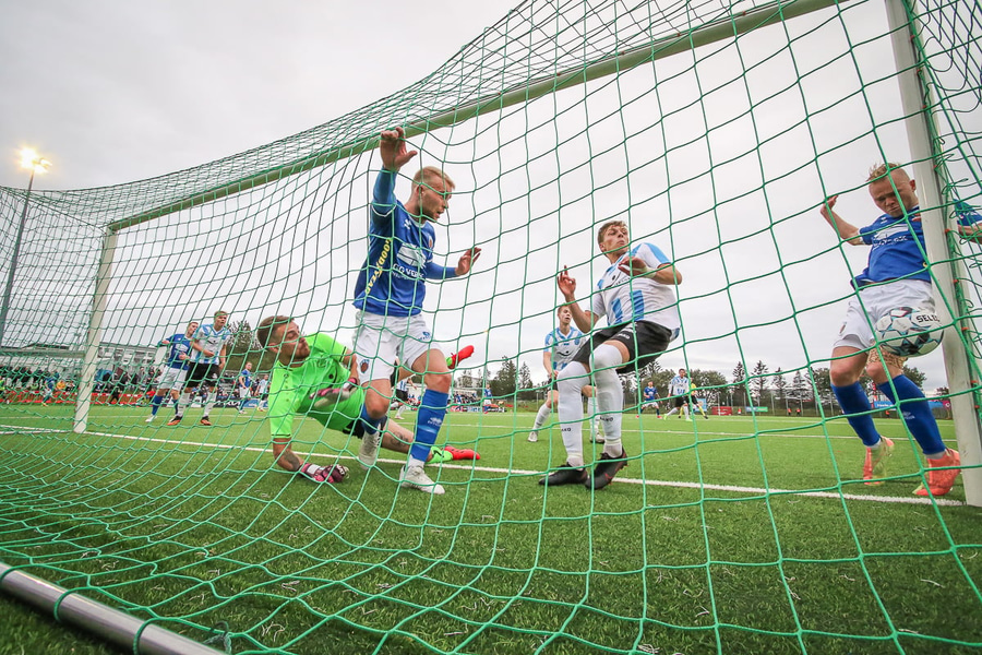 Langt innkast frá Matthíasi. Kyle með skallann. Gunnar Geir ver en Indriði er mættur á fjær og potar honum inn, vel gert!