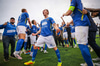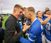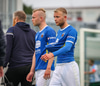 Liðin að rölta inná, fyrirliðirnar heilsast. Arnar Ingi búinn að kasta peningnum upp.