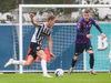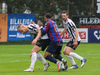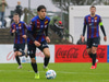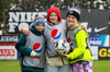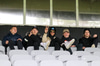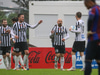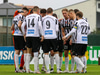 Liðin ganga inn á völlinn. KR leikur í hefðbundnu, svörtu og hvítu. Leiknir er einnig í hefðbundnu, fjólubláu og bláu.