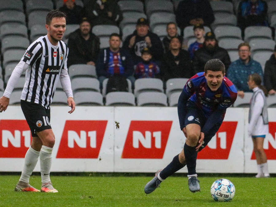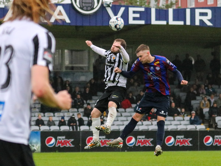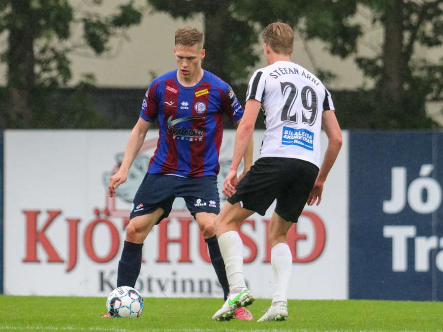Hættulegur bolti hjá Theódóri Elmari en Ægir nær ekki snertingu á boltann og gestirnir hreinsa.