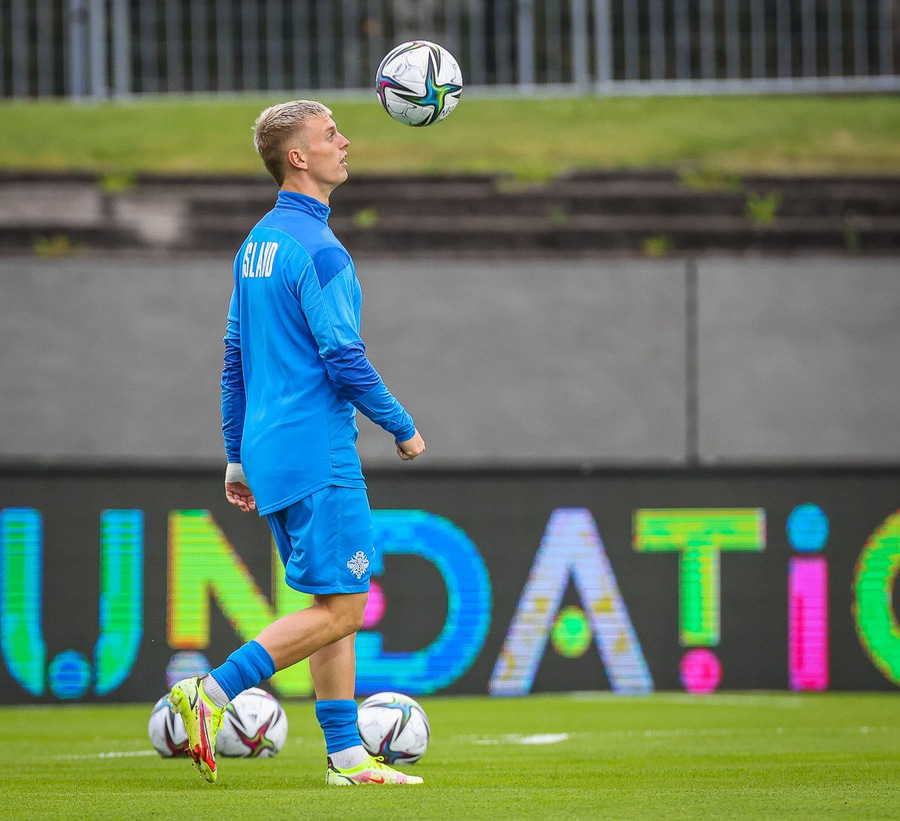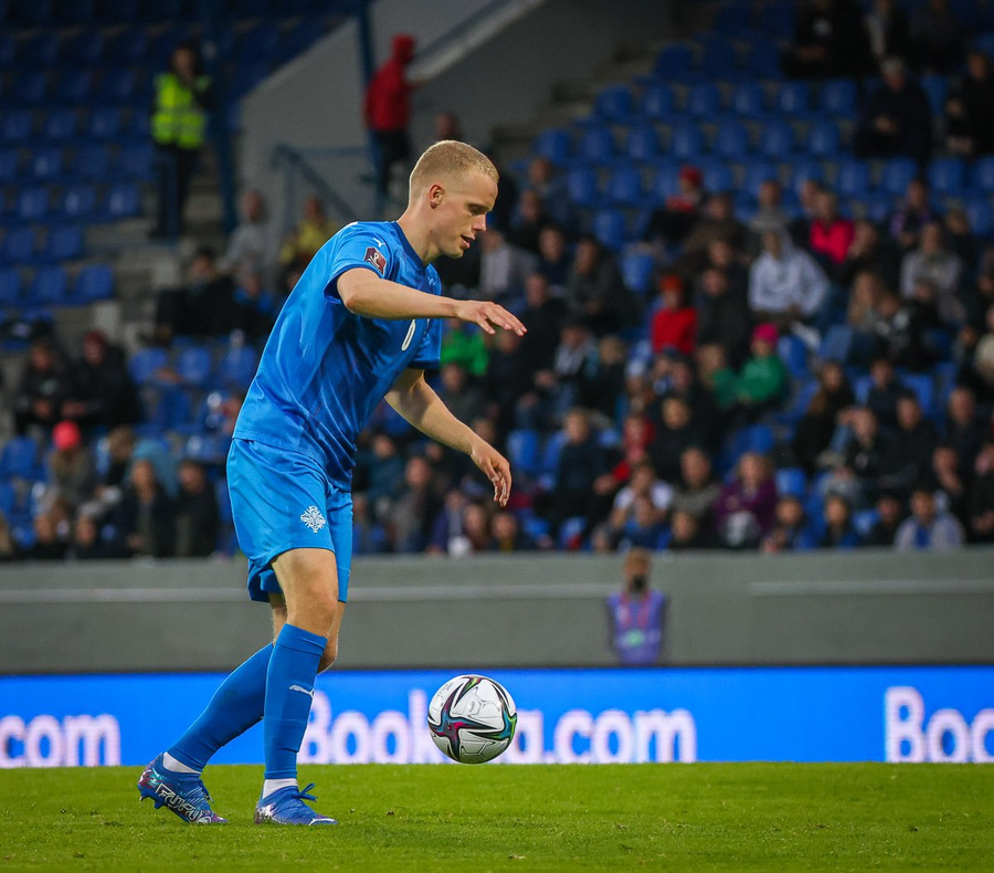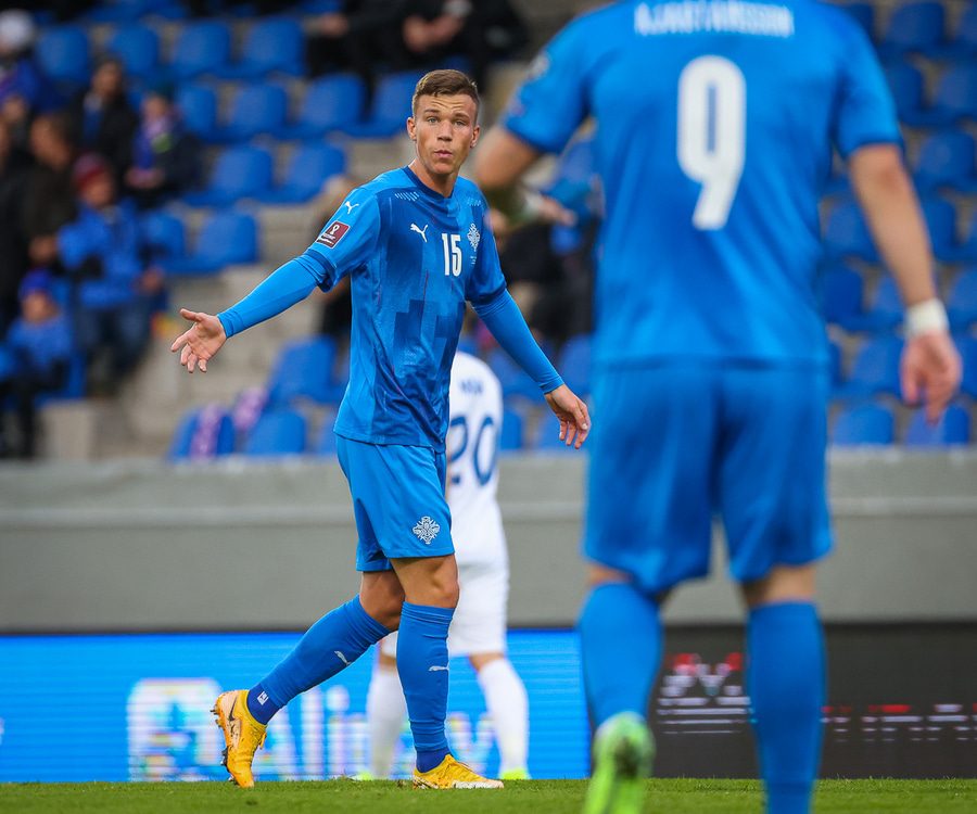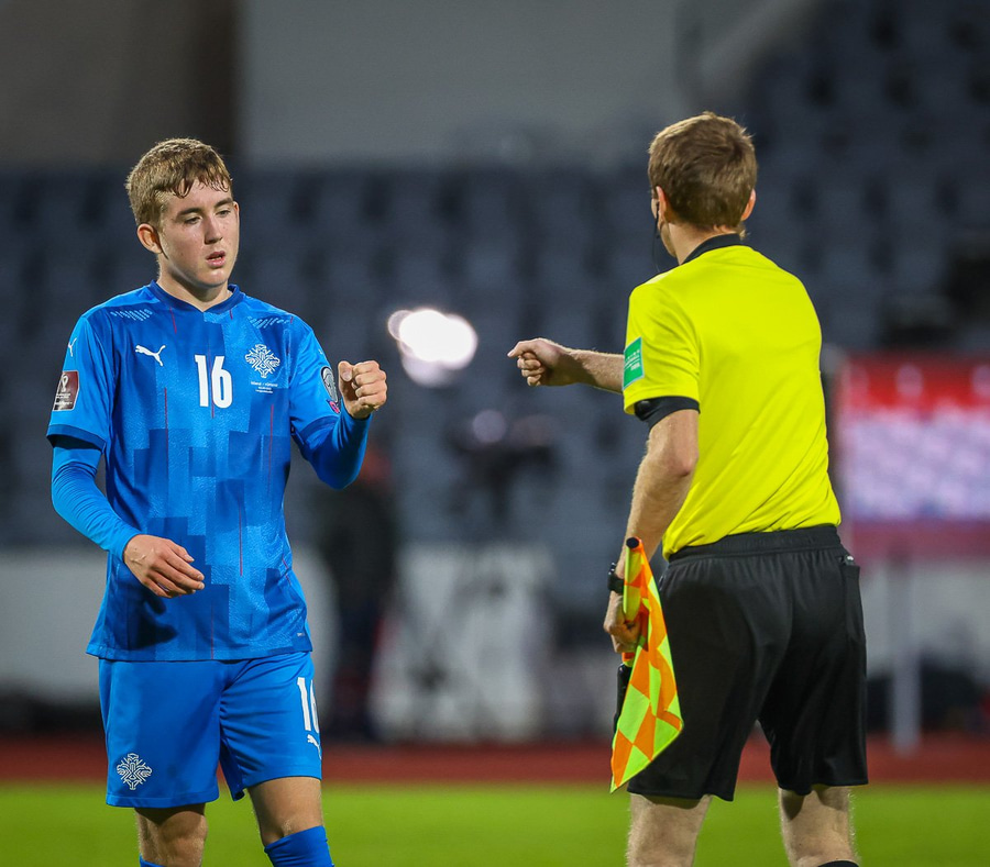 Gult spjald: Ísak Bergmann Jóhannesson (Ísland)