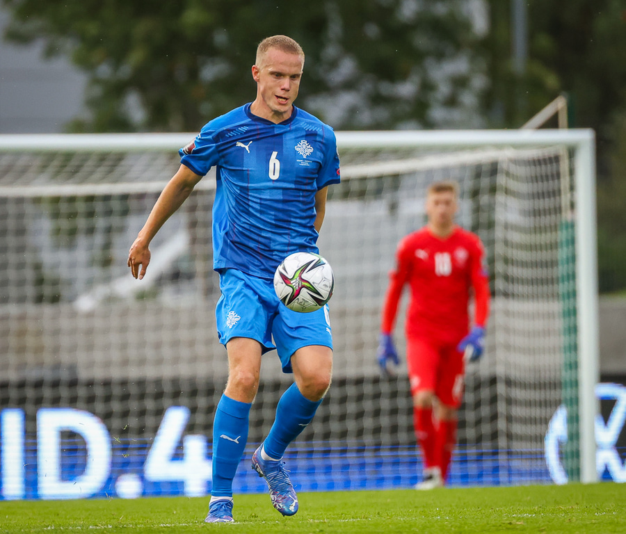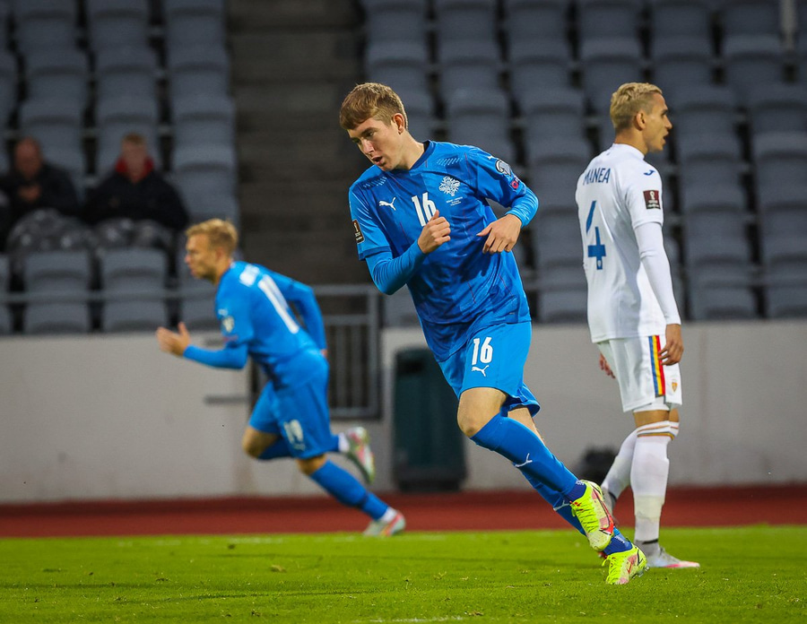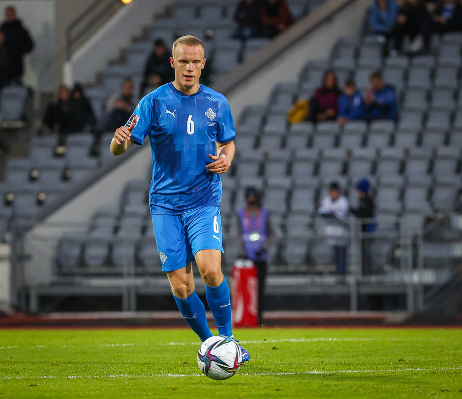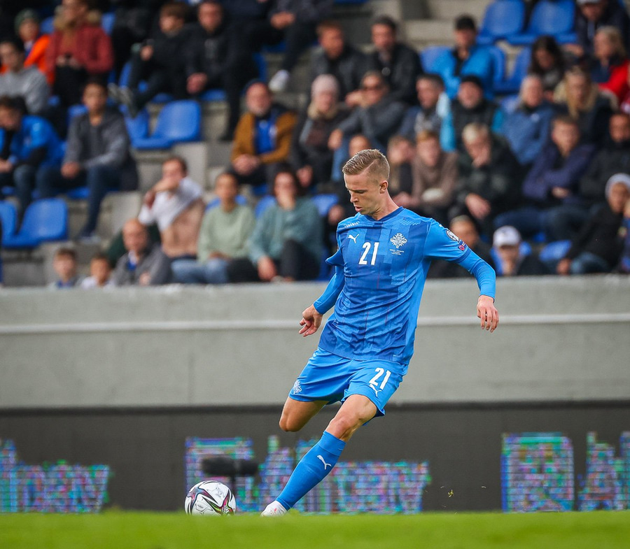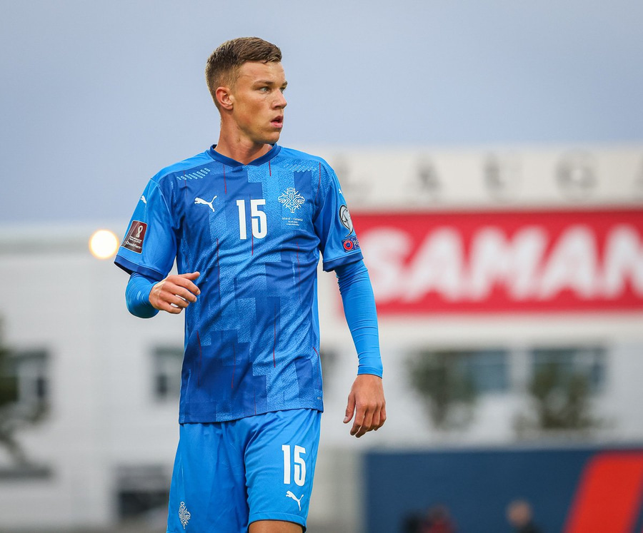 Gult spjald: Ísak Bergmann Jóhannesson (Ísland)