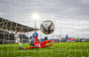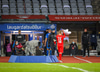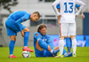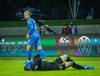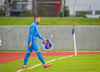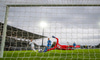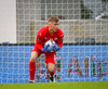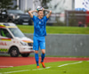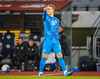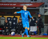 Töltir aftur í markið og leggst svo í grasið þegar leikurinn er stopp og fær skammir fá eigin fyrirliða.
