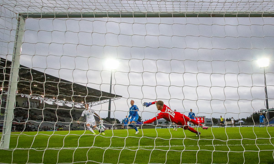 Nicolae Stanciu sleppur einn í gegn og klárar glæsilega fram hjá Rúnari í markinu.