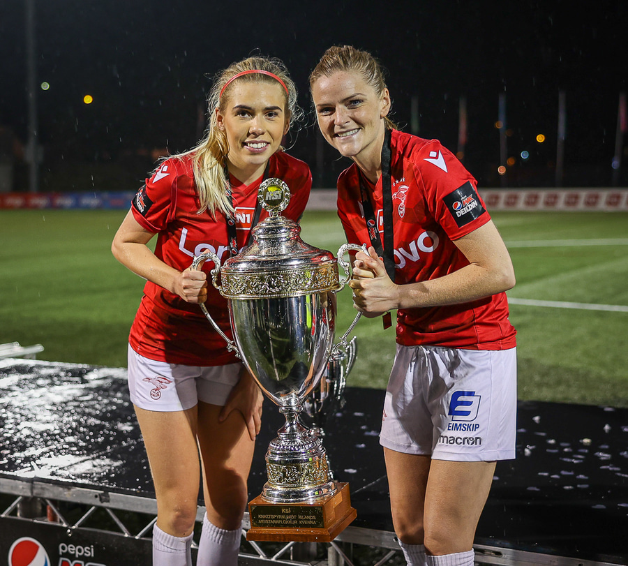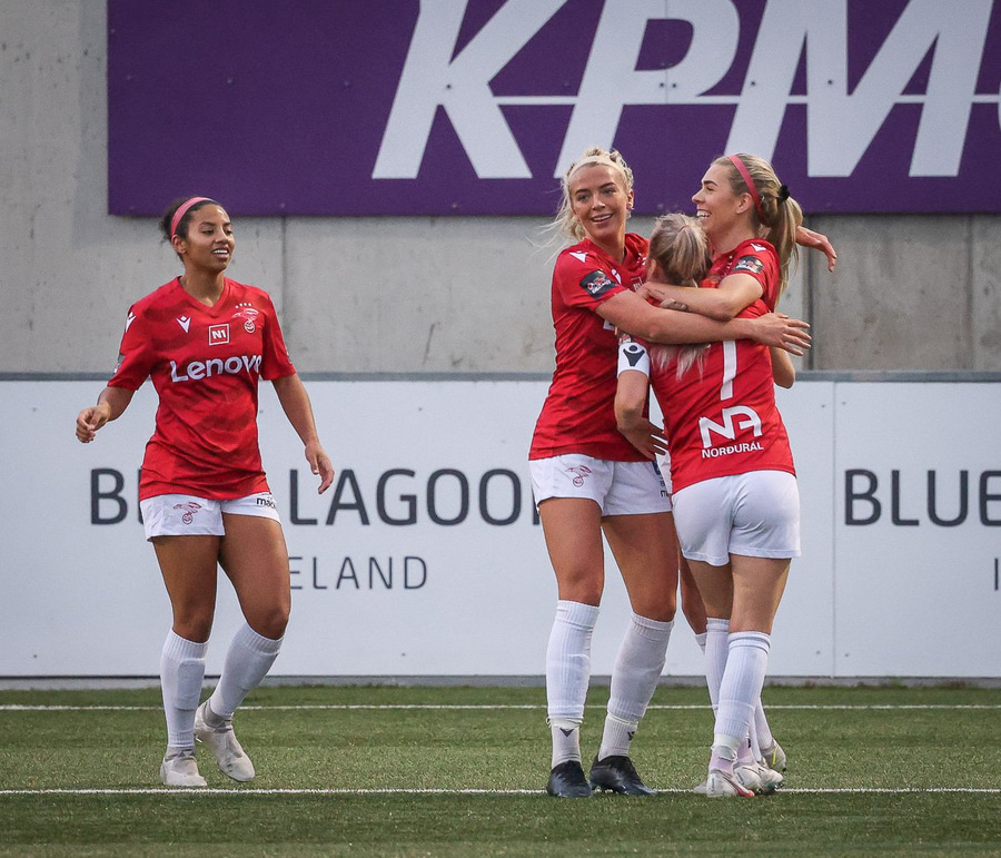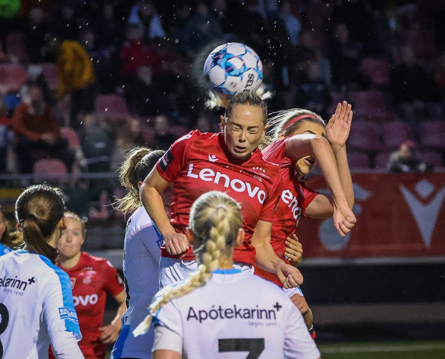 Mary Alice fær boltan fyrir utan teig eftir horn og á tilraun sem er bjargað á línu! Sýndist það vera Brenna sem var þar að verki.