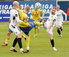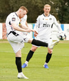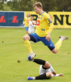 Guðmundur Steinn kemst í þröngt færi en Mikkel Qvist mætir og blokkar skotið í horn.