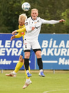 Hallgrímur smellir boltanum beint á hausinn á Mikkel Qvist en Daninn stýrir honum á mitt markið af mjög stuttu færi.