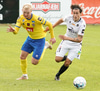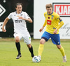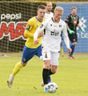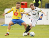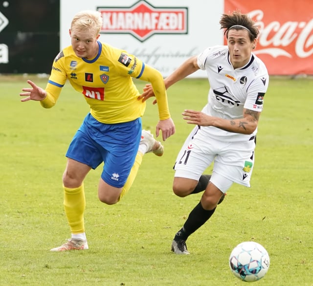 Bæði lið þurfa nauðsynlega á þremur stigum að halda. Hér eltir Hallgrímur Mar Steingrímsson kantmanninn Valdimar Þór Ingimundarson, sem nú spilar með Stromsgödset í Noregi, í leik liðanna í fyrra.