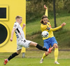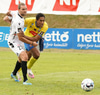 Qvist er stutt frá því að komast í boltann en Fylkismenn hreinsa burt. KA heldur boltanum.