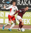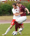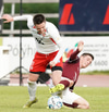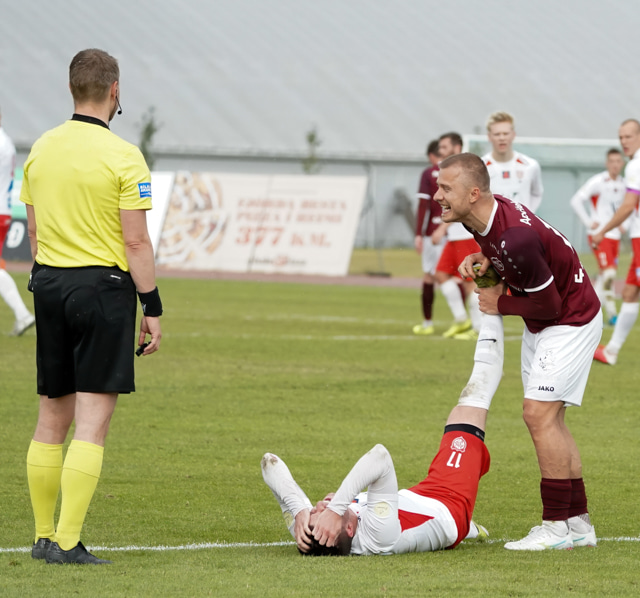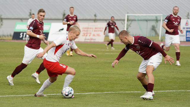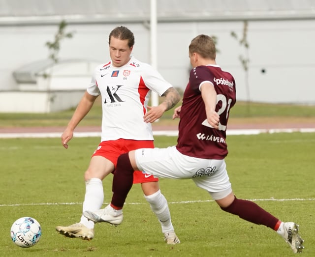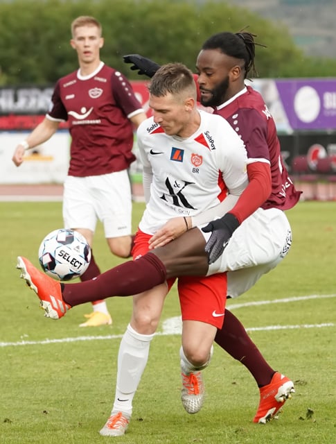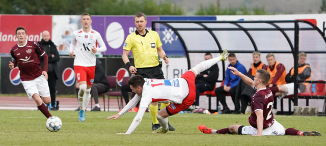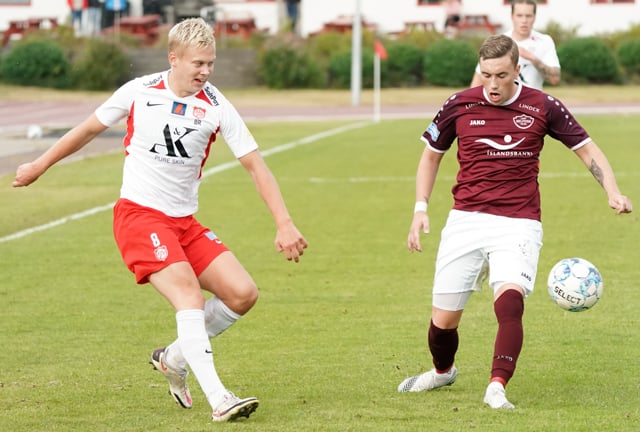 Orri lá eftir í baráttunni við Valdimar á miðjum vellinum. Hressileg bylta en hann er staðinn upp og heldur áfram.