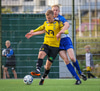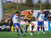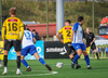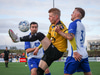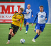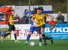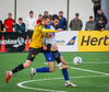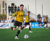 Brynjar með fyrirgjöfina og Alex Davey kemst í boltann en boltinn af honum og til hliðar og hættan rennur út í sandinn.