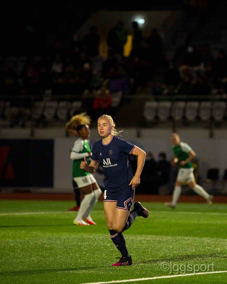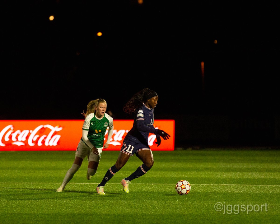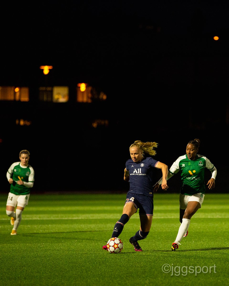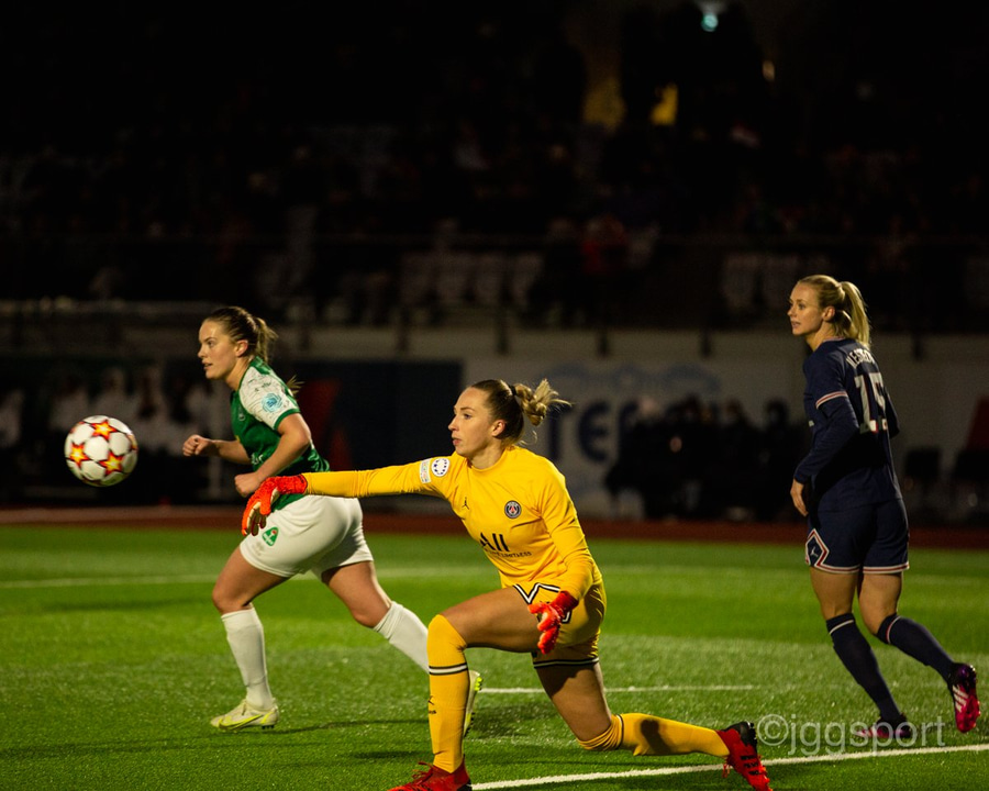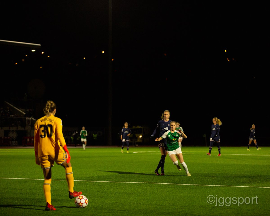 Hættulegt færi hjá PSG. Það kemur bolti inn í teig frá vinstri á Marie-Antoinette en Kristín Dís gerir vel og er alveg við hana og skýtur Marie-Antoinette rétt framhjá