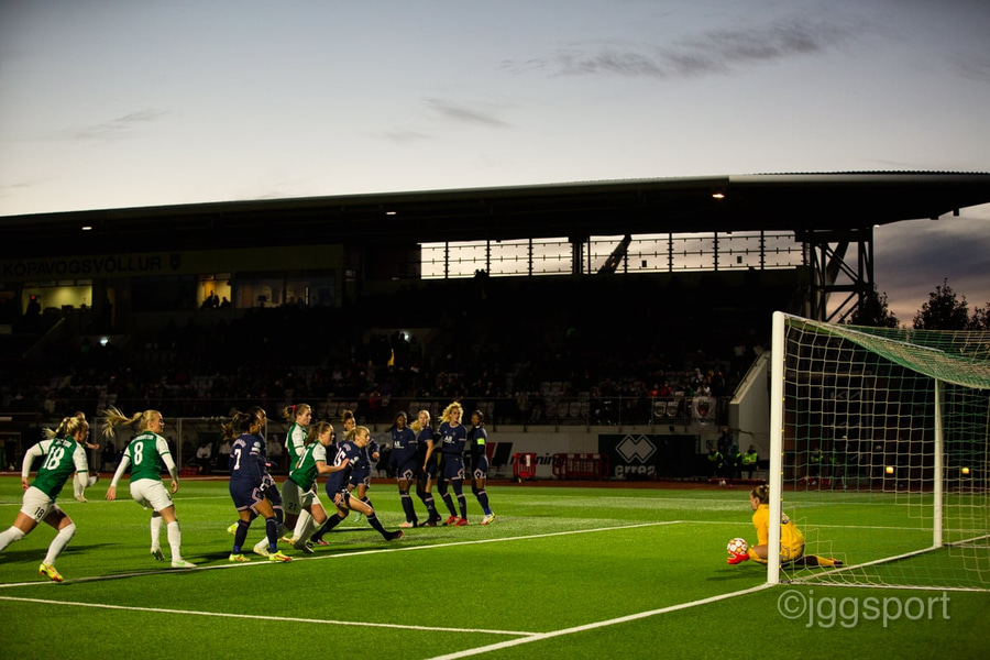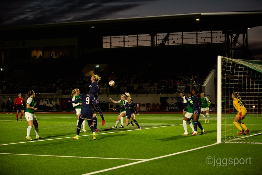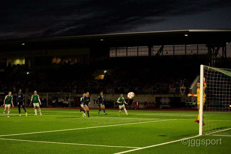 ÞAÐ ER STÓRHÆTTA EFTIR HORNSPYRNUNA. Nokkrir Blikar reyna skot inni í teig sem fara í varnarmenn PSG og þetta endar þegar Kristín Dís fær góðan bolta á fjær og engu munar að hún nái að skalla knöttinn í netið en hann fór rétt framhjá.