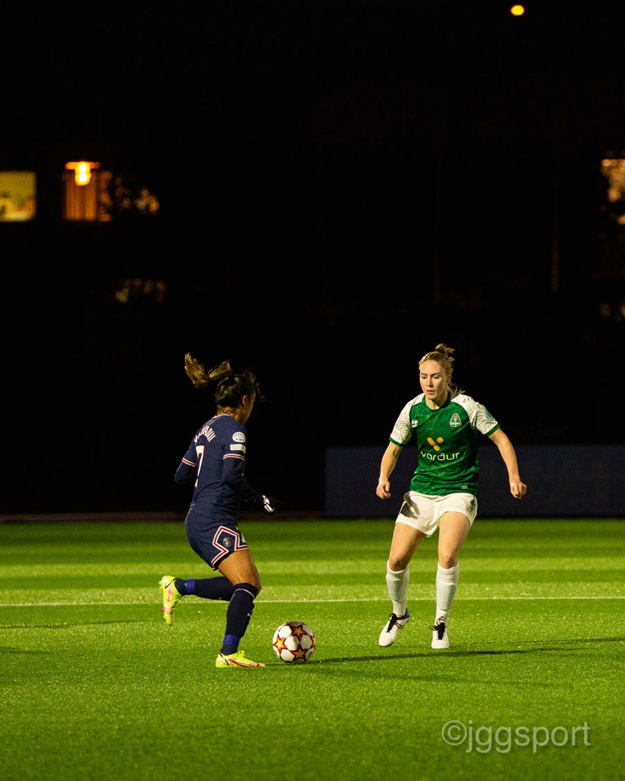 Hér má sjá Hildi Antons í baráttunni um boltann í síðasta leik Blika við PSG.