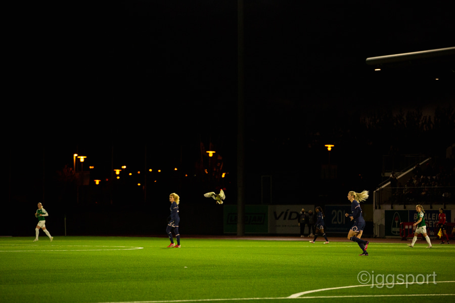 Þetta er farið af stað kæru lesendur. PSG byrjar með boltann og þær sækja í átt að Fífunni.