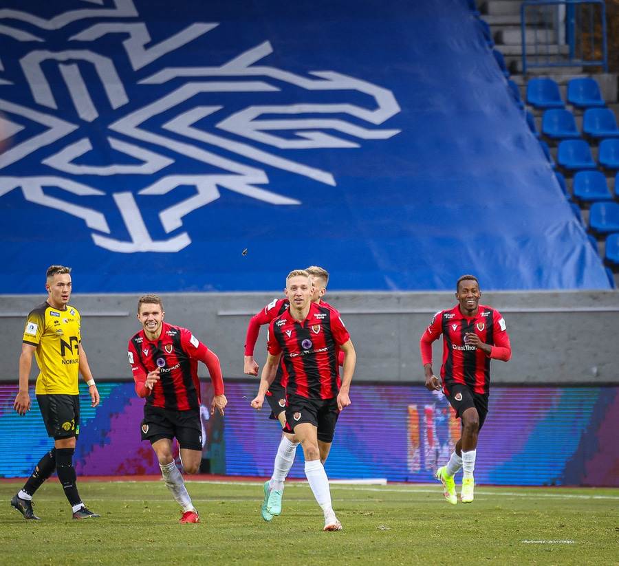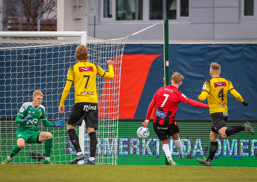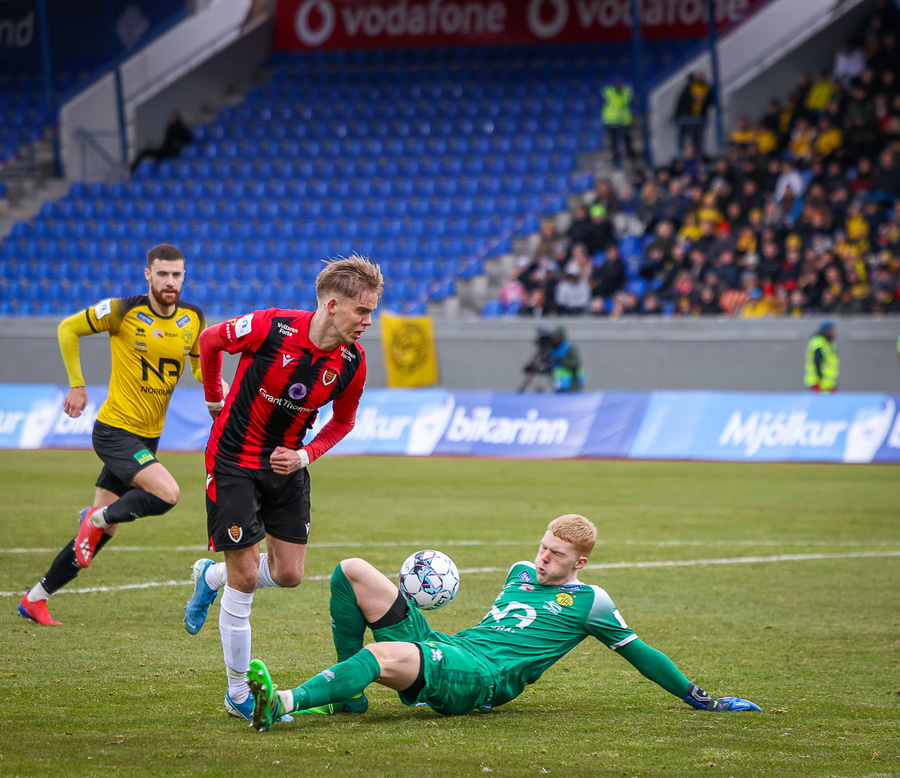 Boltinn kemur upp hægri kantinn á Viktor Jónsson sem á frábæra sendingu á fjær þar sem Gísli Laxdal mætir og skallar boltann í jörðina og framhjá