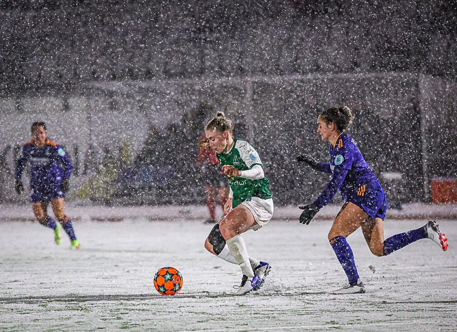 Vel unninn bolti hjá Blikum. Taylor fer í átt að teig Real, reynir skot en Rocio Galvez kemst fyrir.