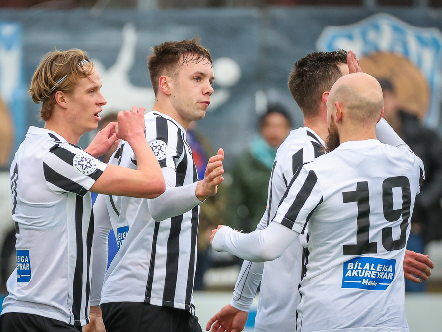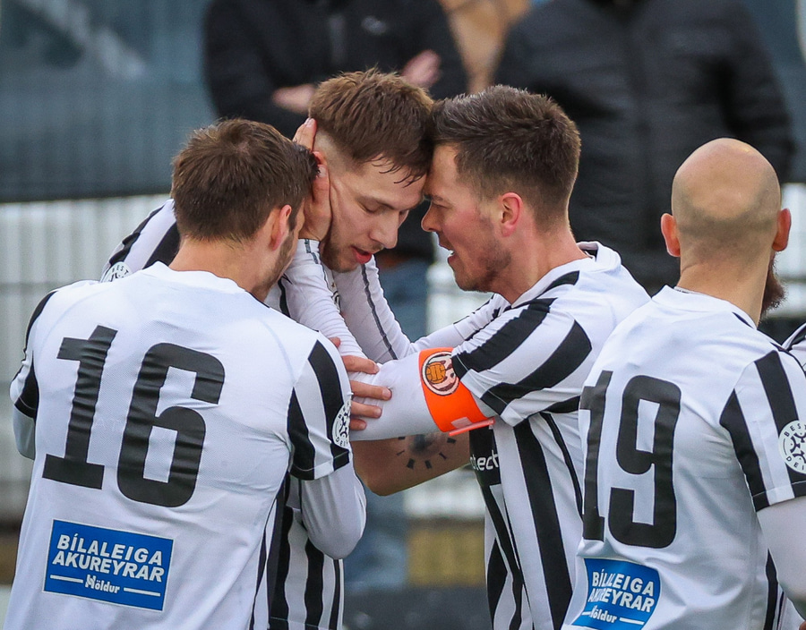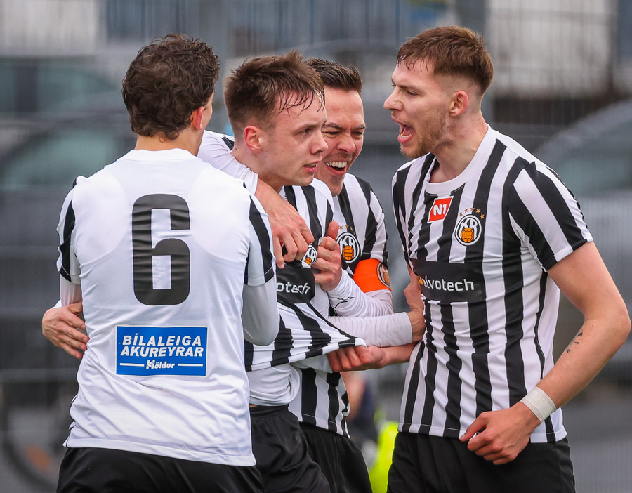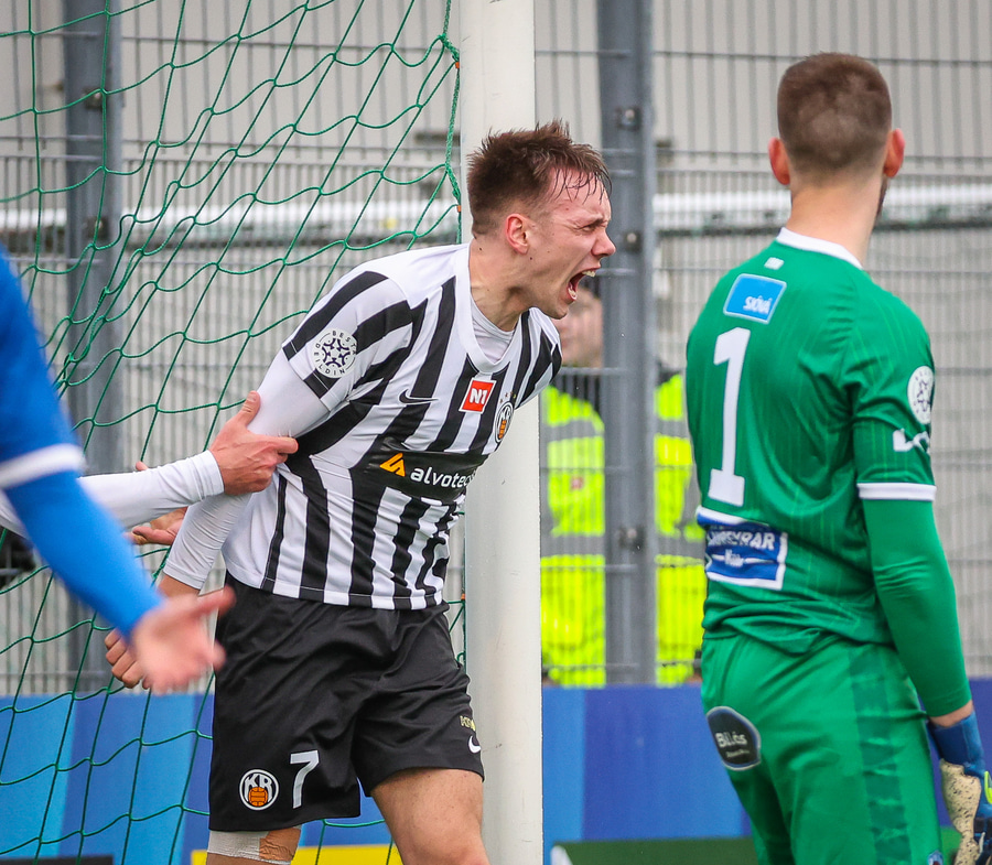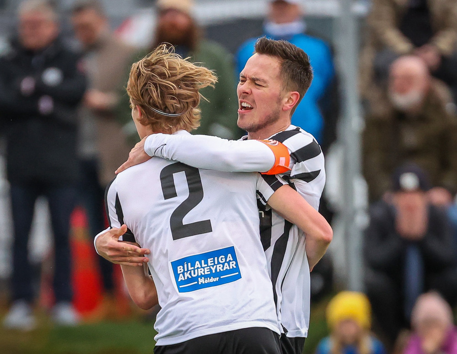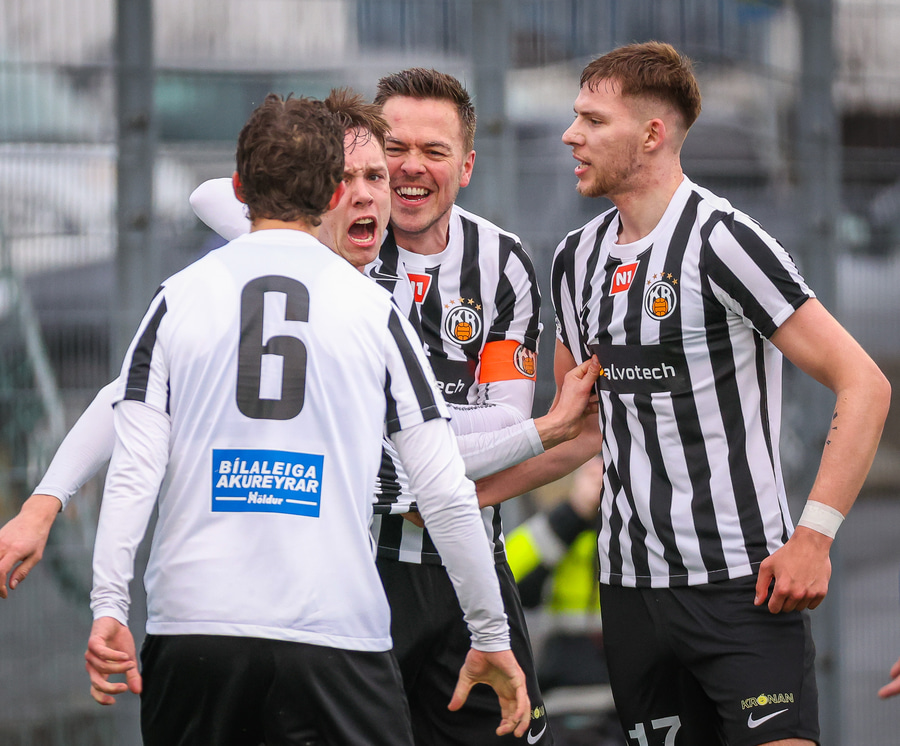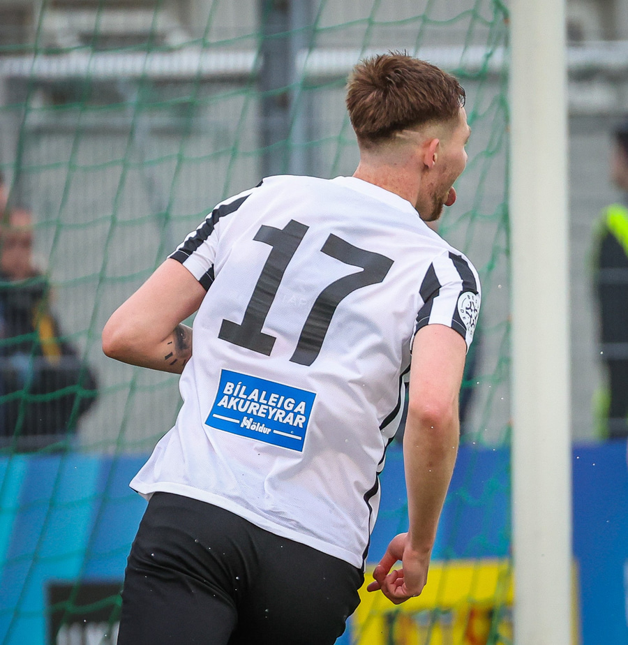 Aukaspyrna frá hægra vítateigshorni sett inn á nærstöng þar sem Finnur Tómas er skuggalega einn og skallar boltann í netið af mjög mjög mjög stuttu færi.