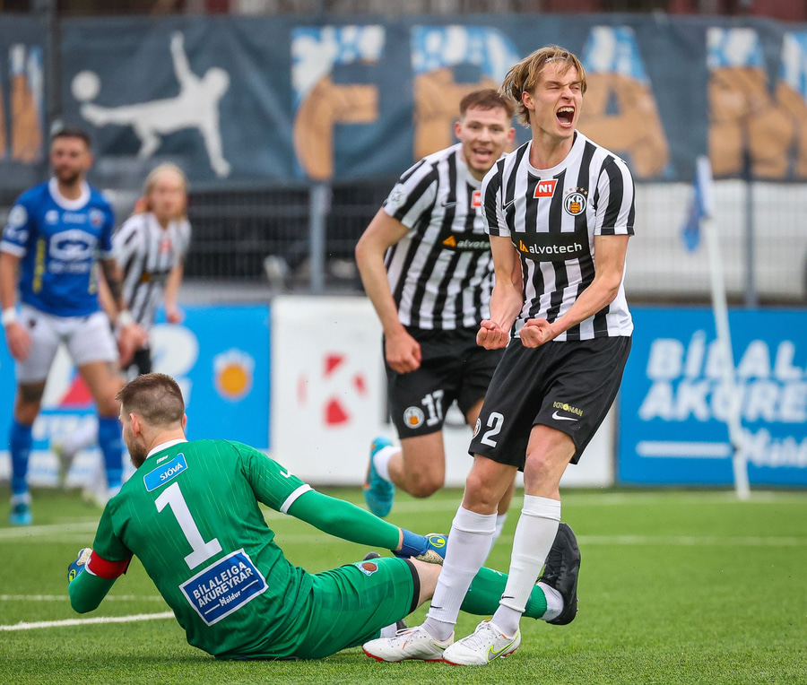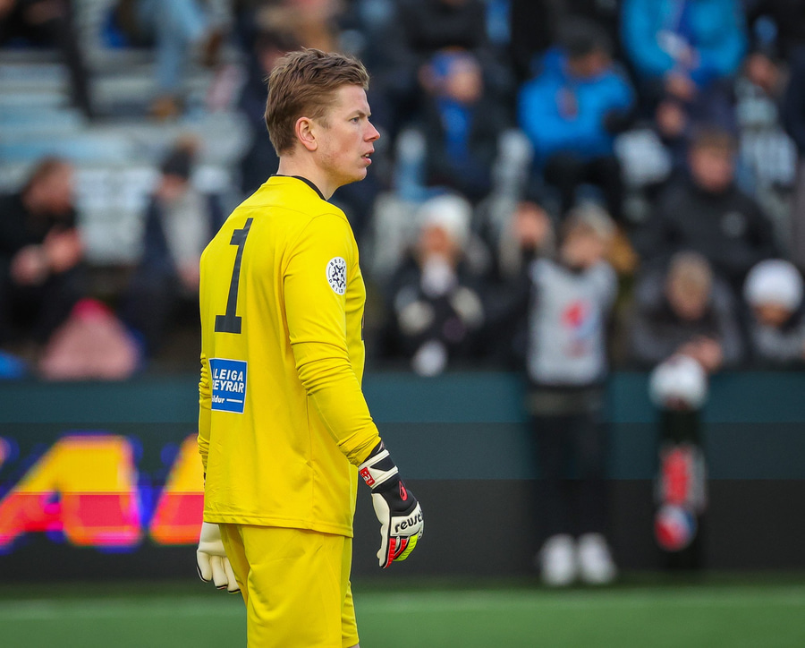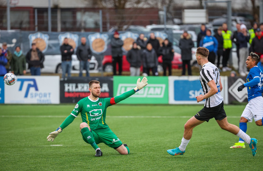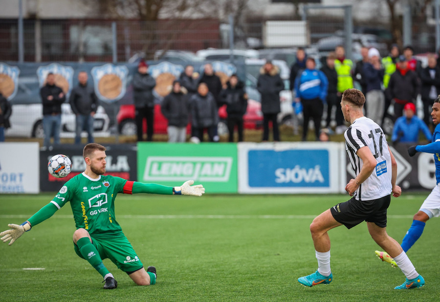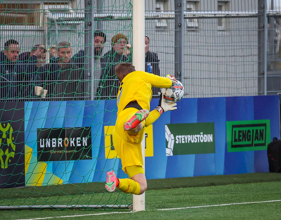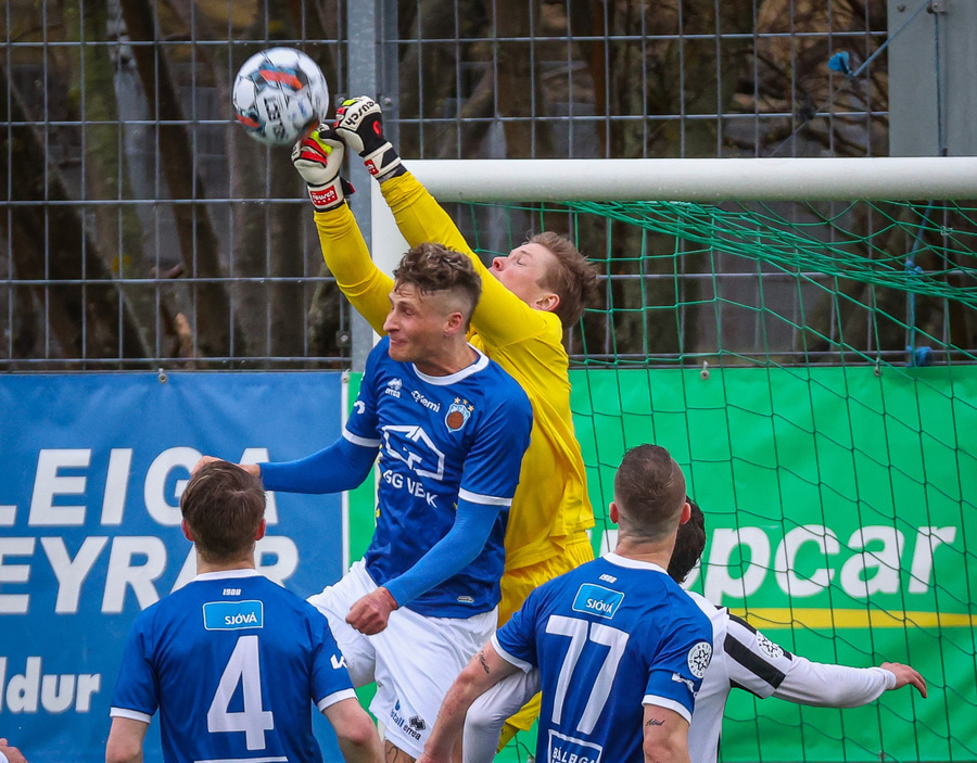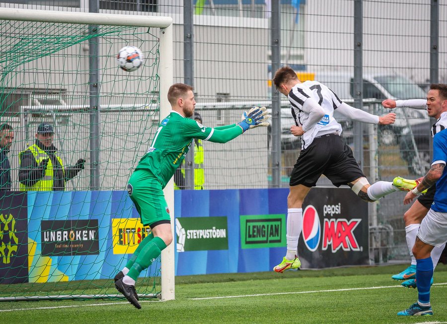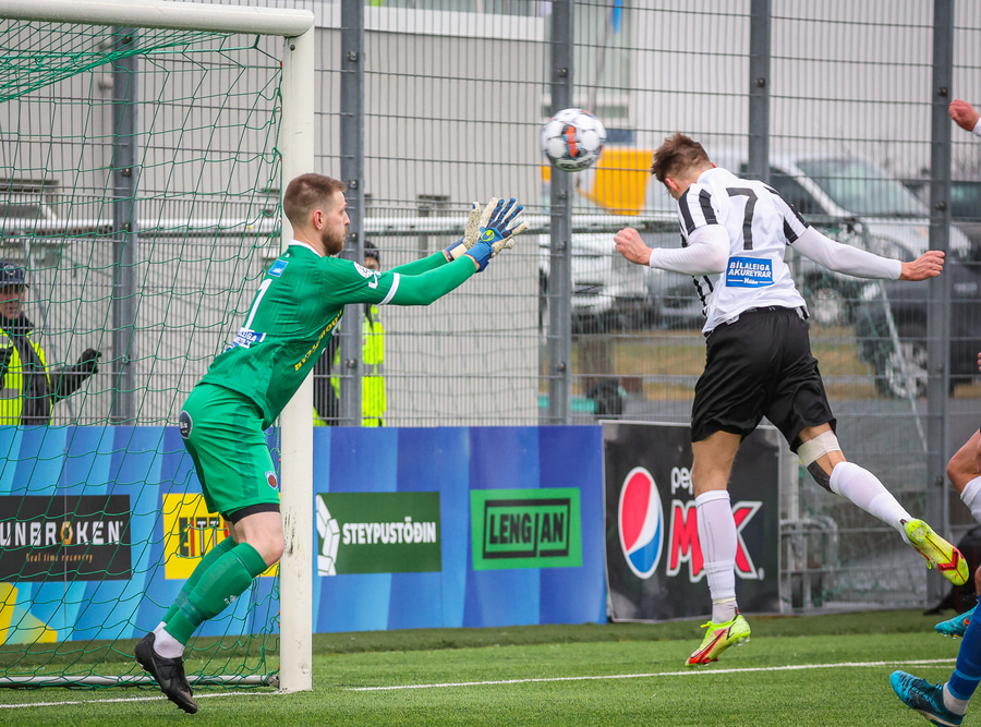 Indriði með lúmskt skot sem Beitir ver en heldur ekki. Jannik fylgir á eftir en Beitir snöggur að ná áttum og kastar sér fyrir og ver aftur, boltinn svo af Jannik og afturfyrir.