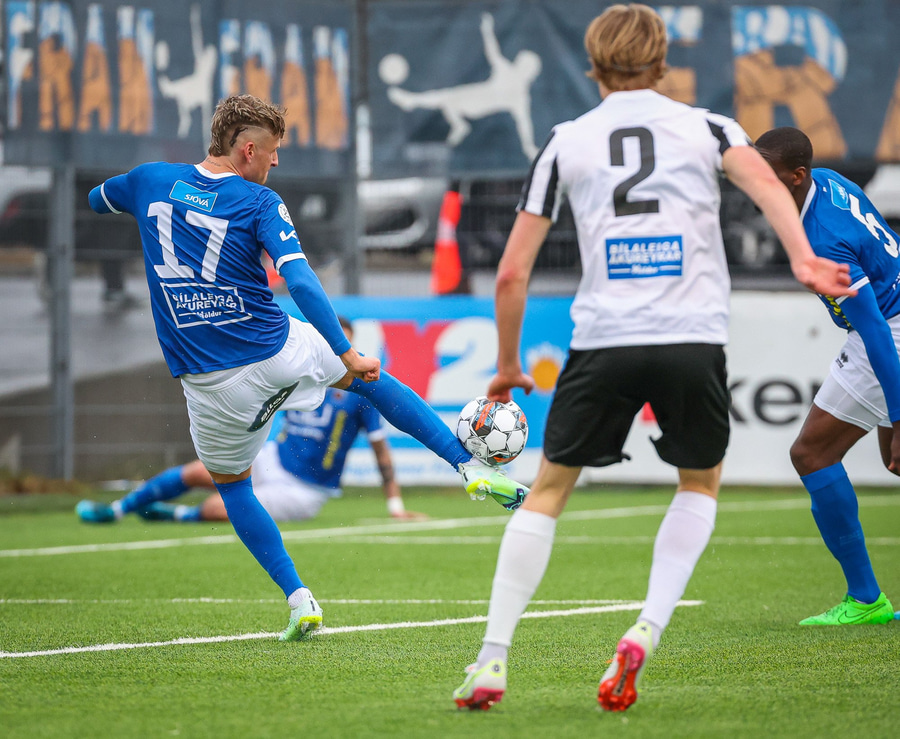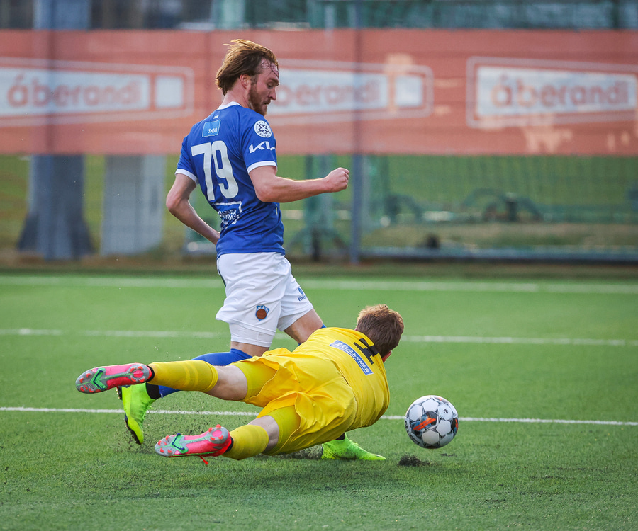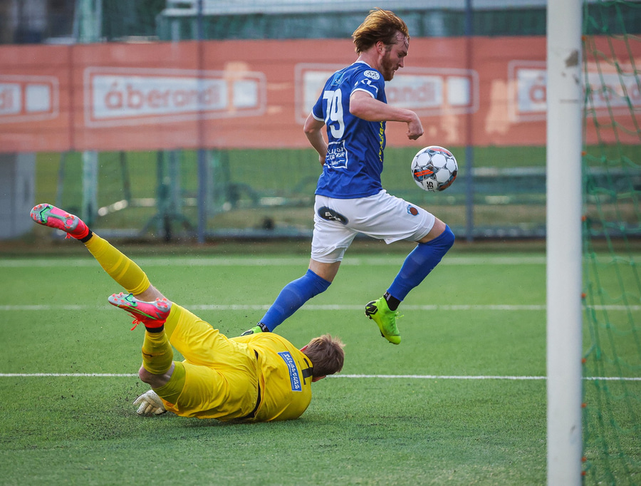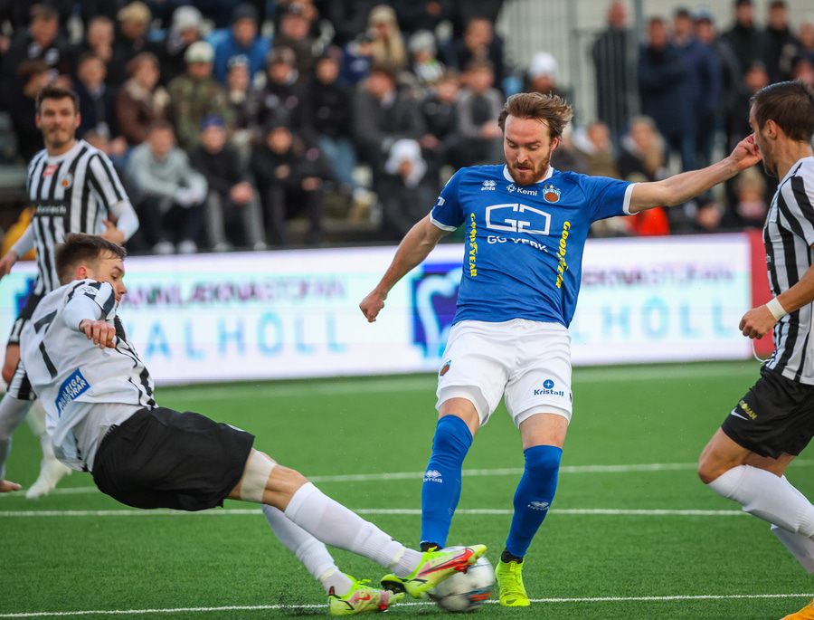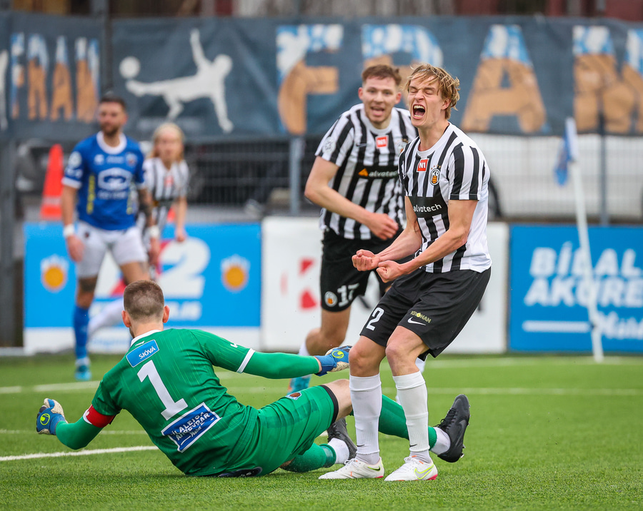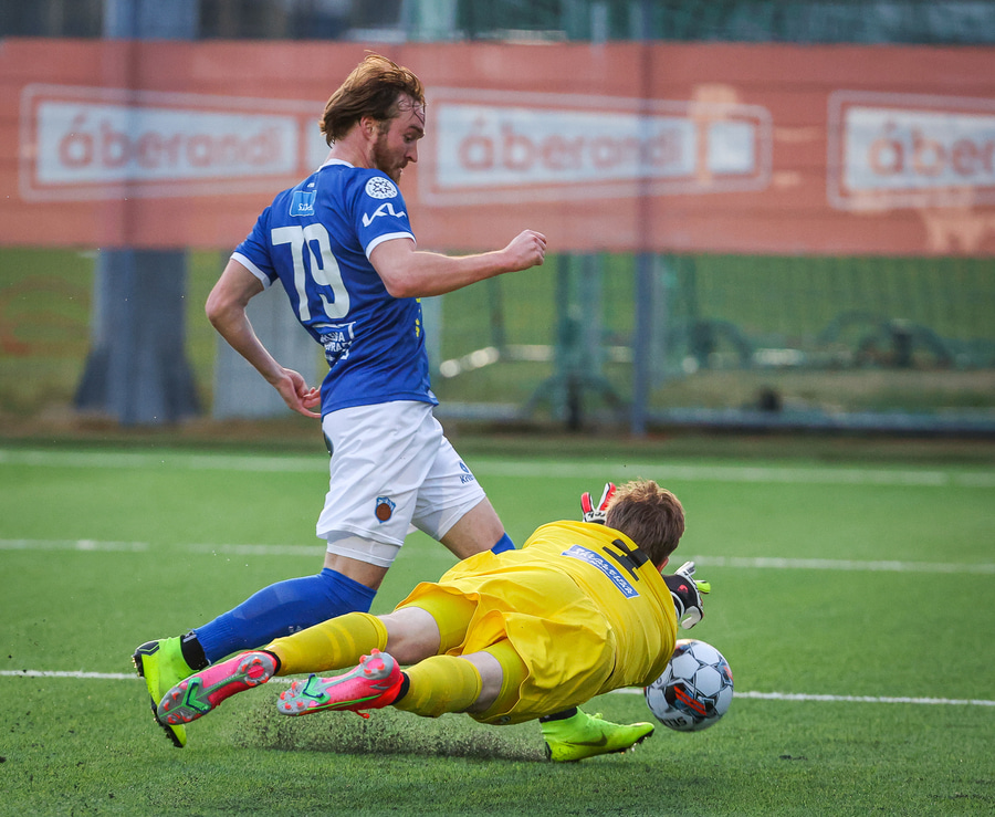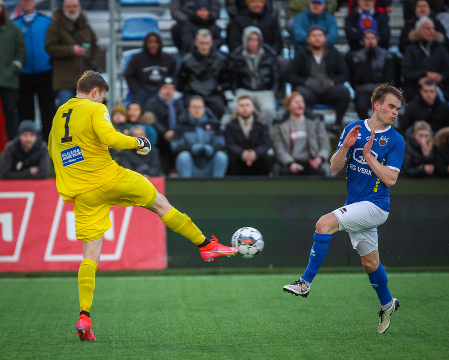 Indriði með lúmskt skot sem Beitir ver en heldur ekki. Jannik fylgir á eftir en Beitir snöggur að ná áttum og kastar sér fyrir og ver aftur, boltinn svo af Jannik og afturfyrir.