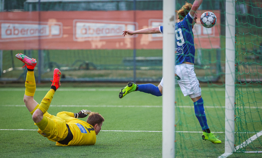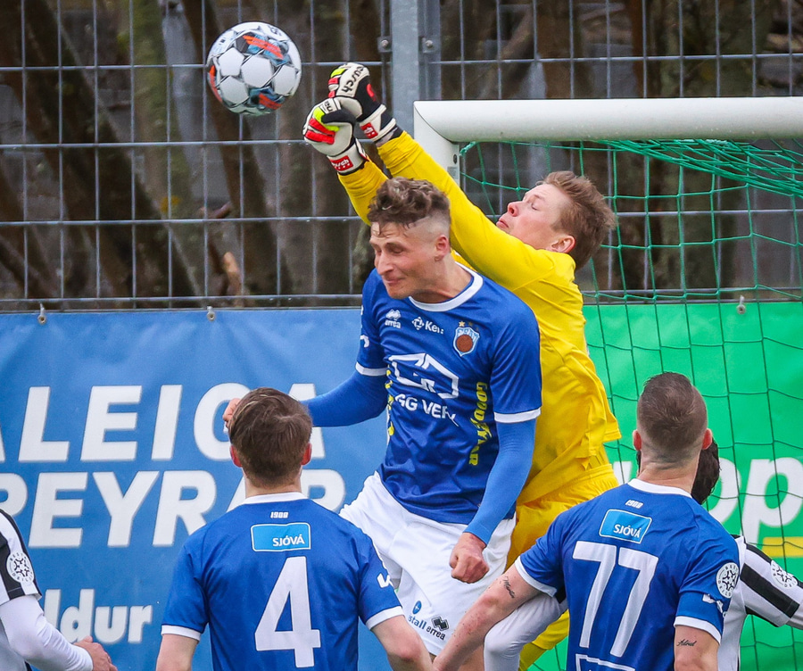 Gummi Magg nær skallanum sem stefnir í skeytinn en Beitir eins og köttur og kastar sér á boltann og heldur honum.