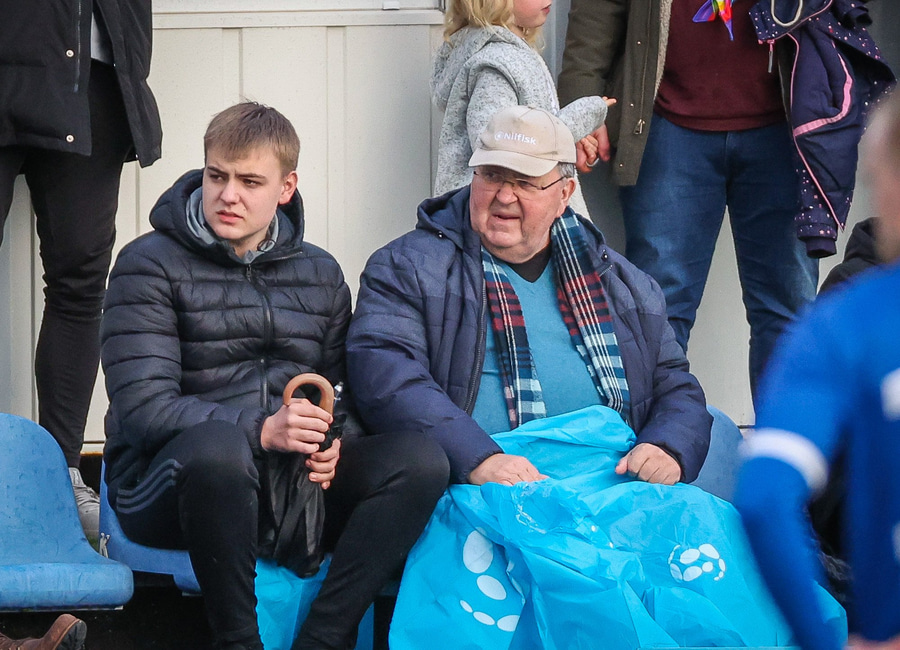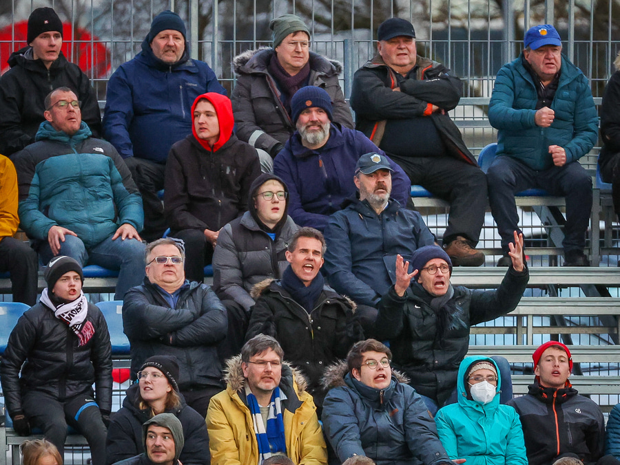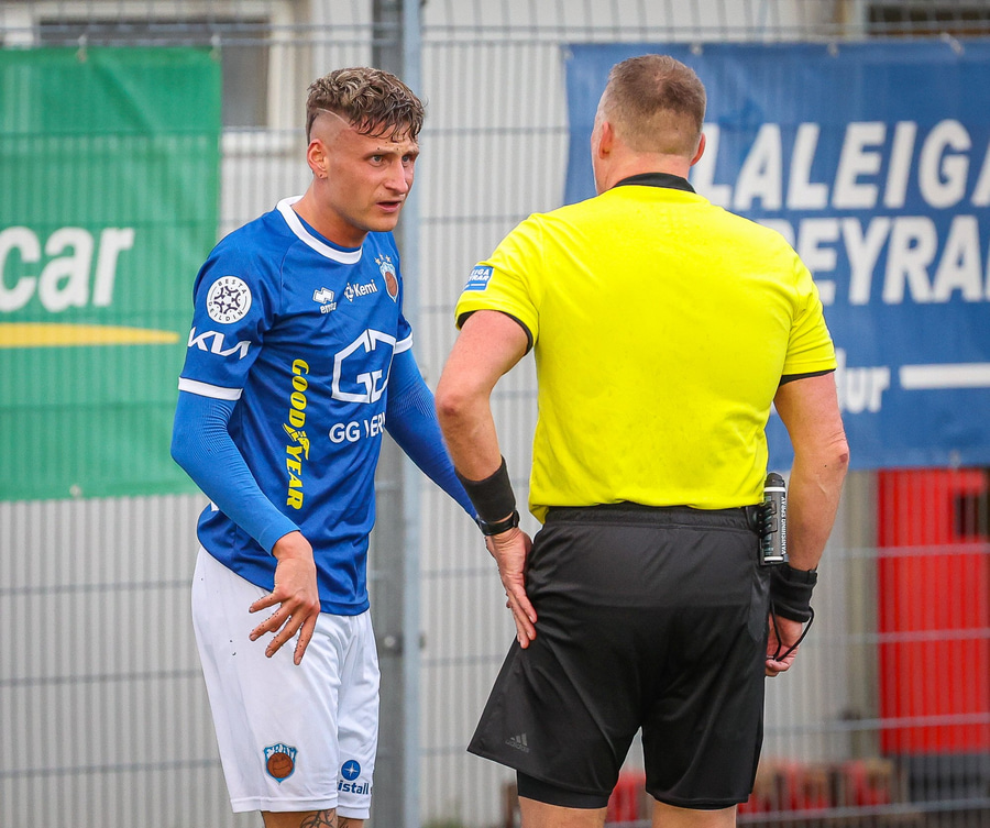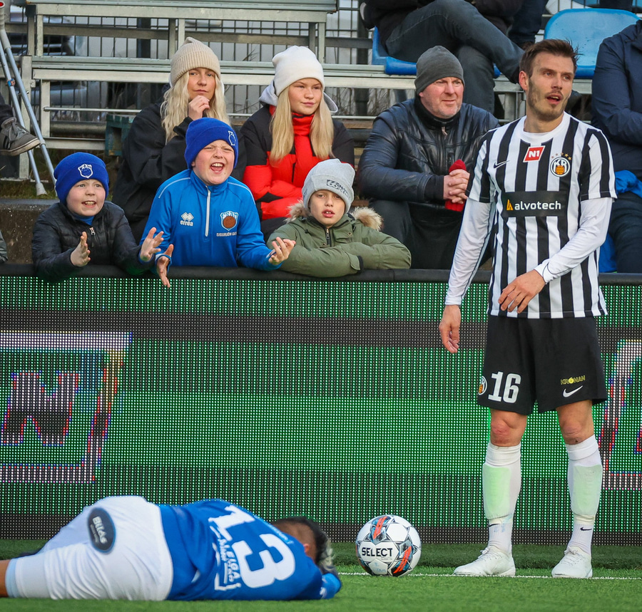 Gummi Magg fer niður eftir baráttu á miðjum vellinum og heimamenn ekki sáttir. Stendur þó fljótt upp og er í lagi.