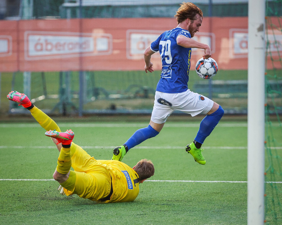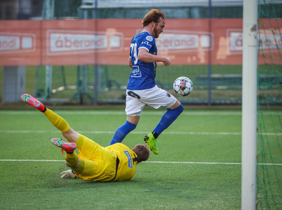 Sigurður Bjartur fær boltann i svæði með mann fyrir framan sig, Keyrir í átt að marki og checkar ögn inn á völlinn áður en hann leggur hann smekklega framhjá Ólafi í markinu.