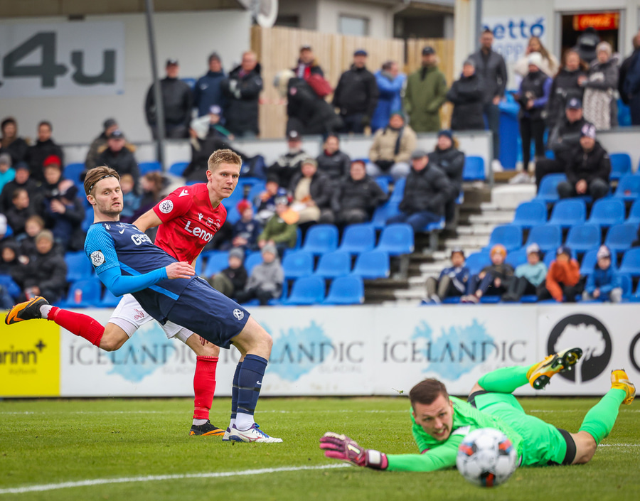 Guðmundur Andri vinnur boltann á vallarhelmingi Keflavíkur, finnur Aron í fætur sem lyftir boltanum fyrir markið þar sem óvaldaður Tryggvi skallar að marki. Sindri hleður í alvöru vörslu og flaggið fer á loft sömuleiðis.