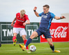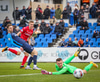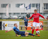 Tryggvi Hrafn sleppur í gegn en nær ekki að leggja boltann fyrir sig og færið rennur út í sandinn.