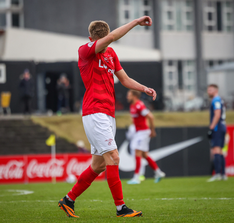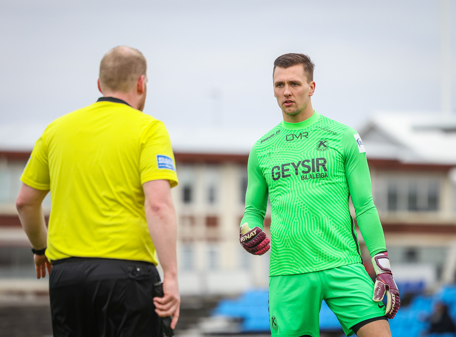 Rúnar Þór með rosalegan klobba á Guðmund Andra og á svo fyrirgjöf sem ég gat ekki séð betur en að færi í höndina á Birki.