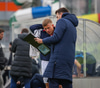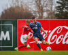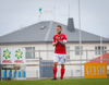 Vindurinn þýtur upp völlinn og leggur boltann fyrir markið, Patrick í fínu skotfæri en hittir ekki boltann.