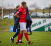 Aron Jó að kveinka sér eftir að á honum var brotið. Haltrar um völlinn en heldur áfram.
