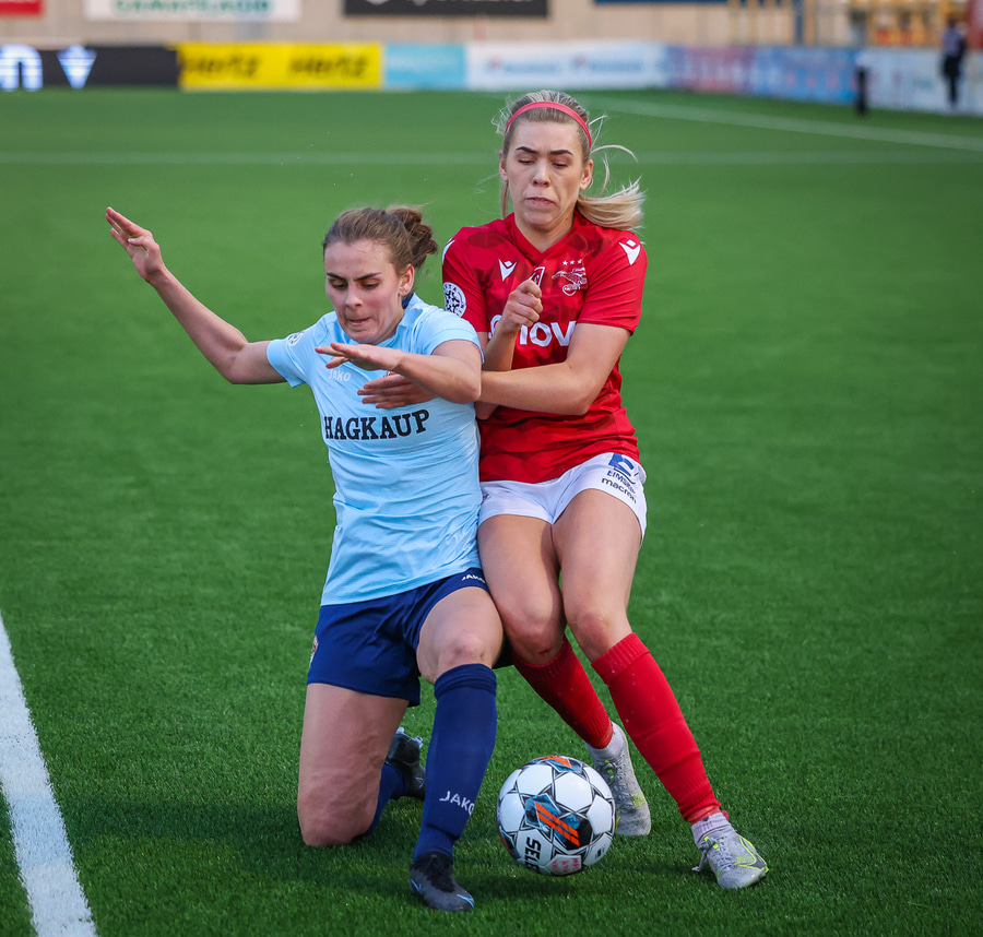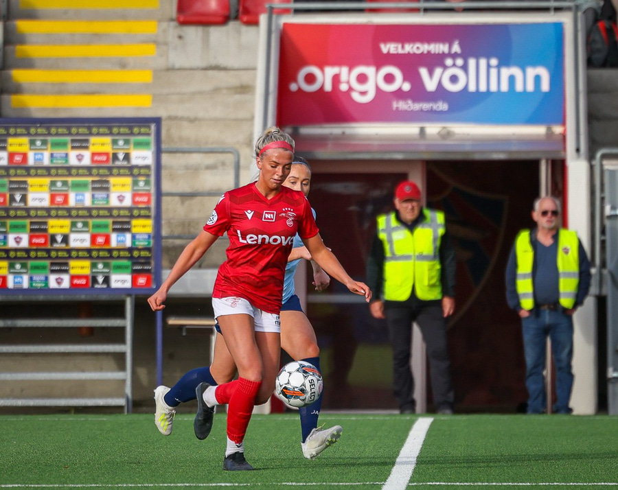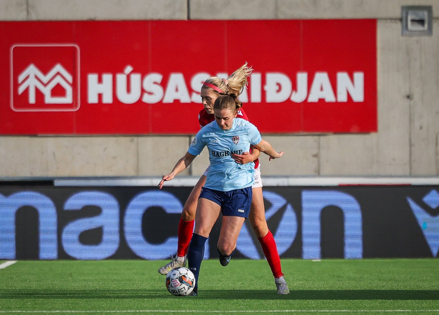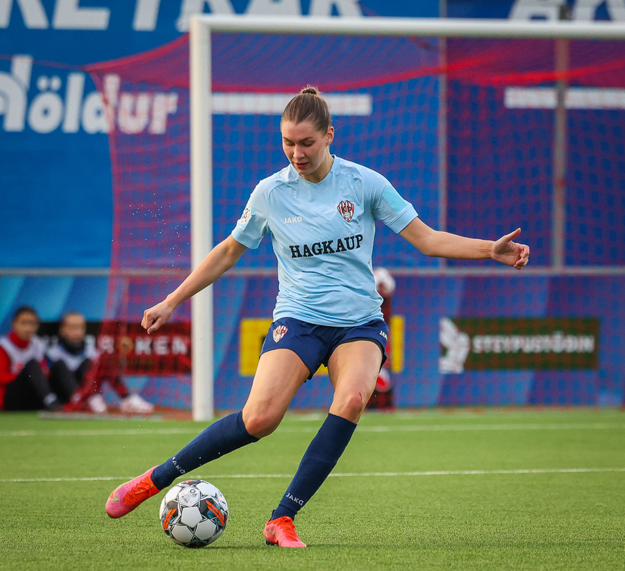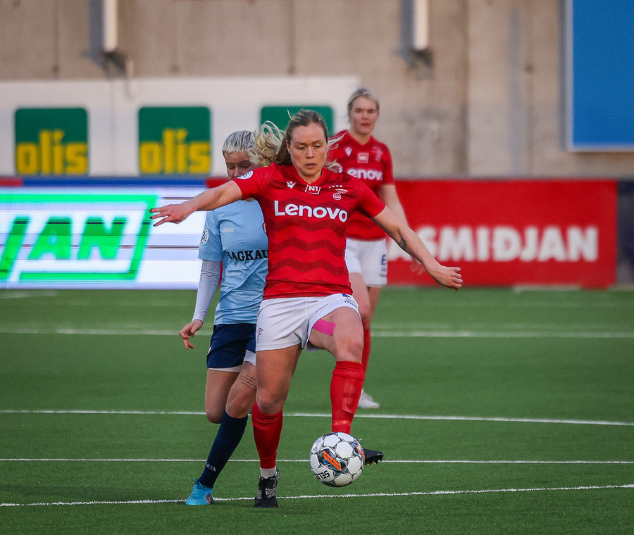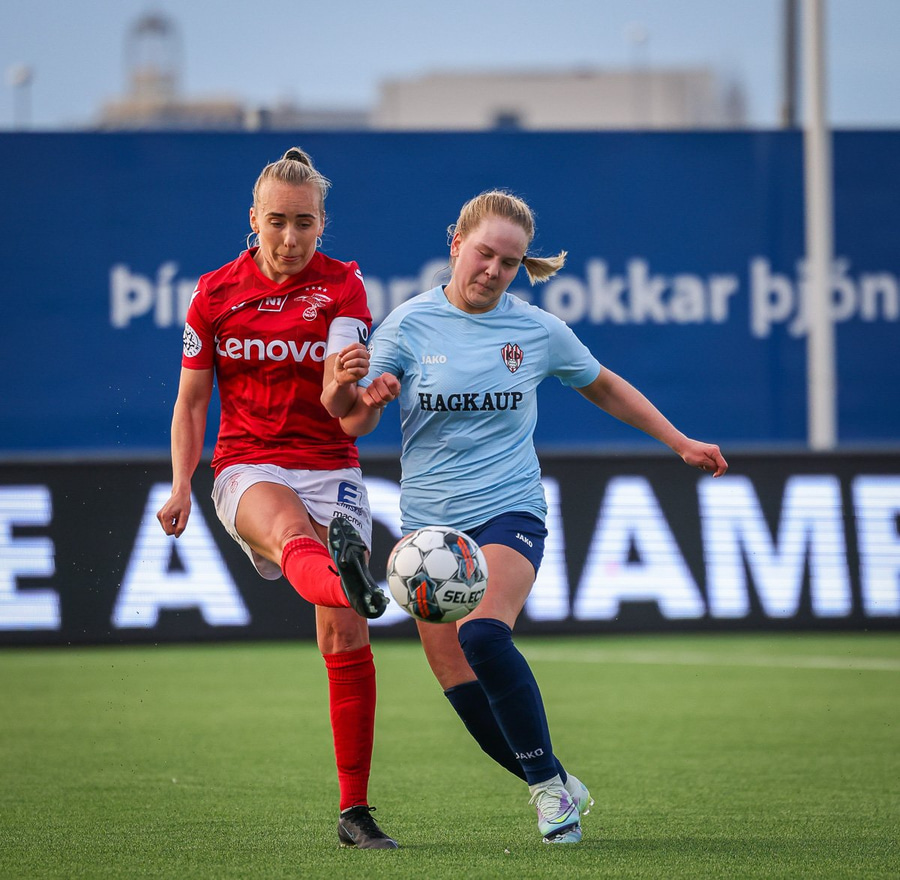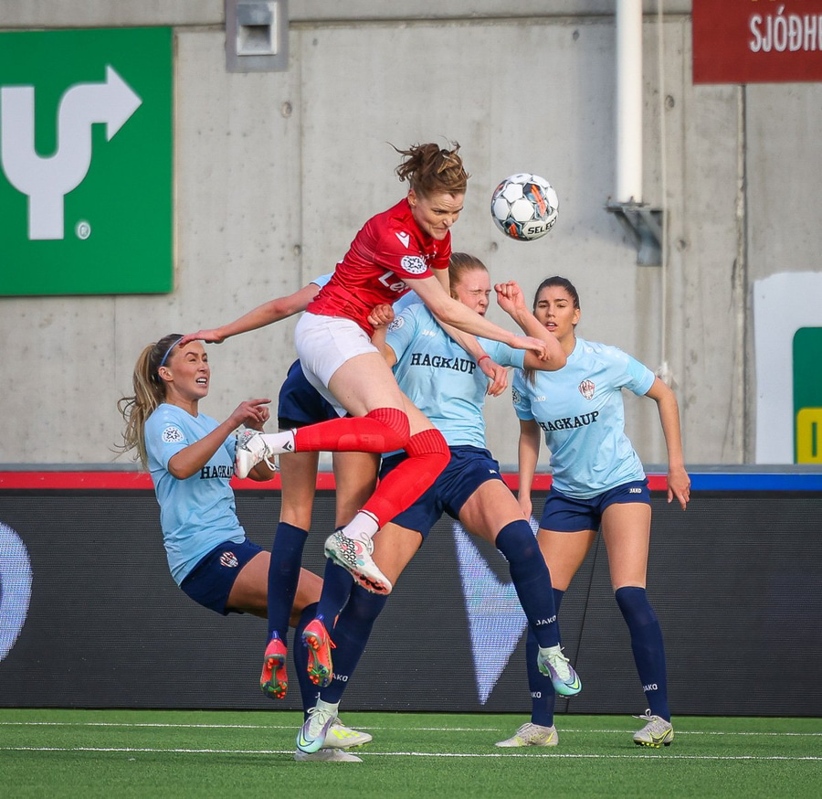 Heimakonur sparka leiknum í gang. Þær sækja í átt að Öskjuhlíðnni.
