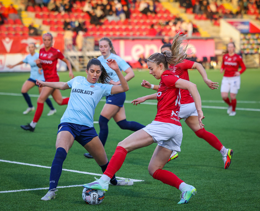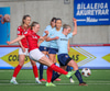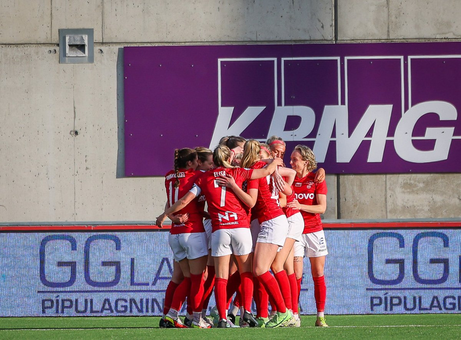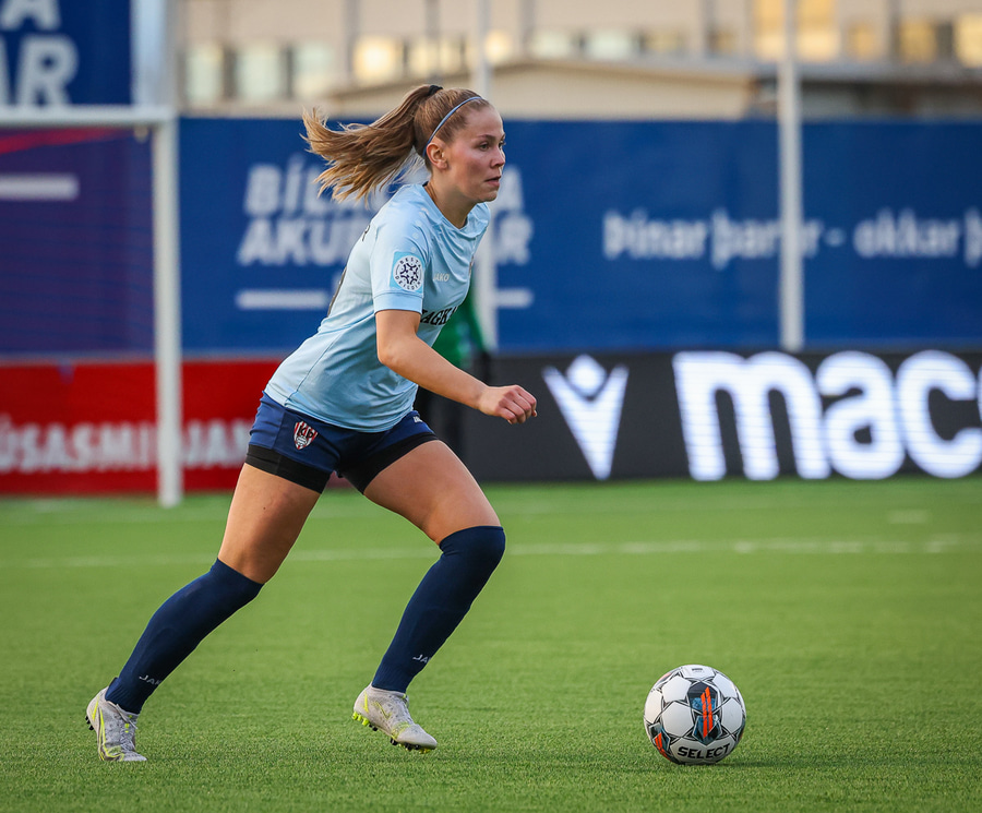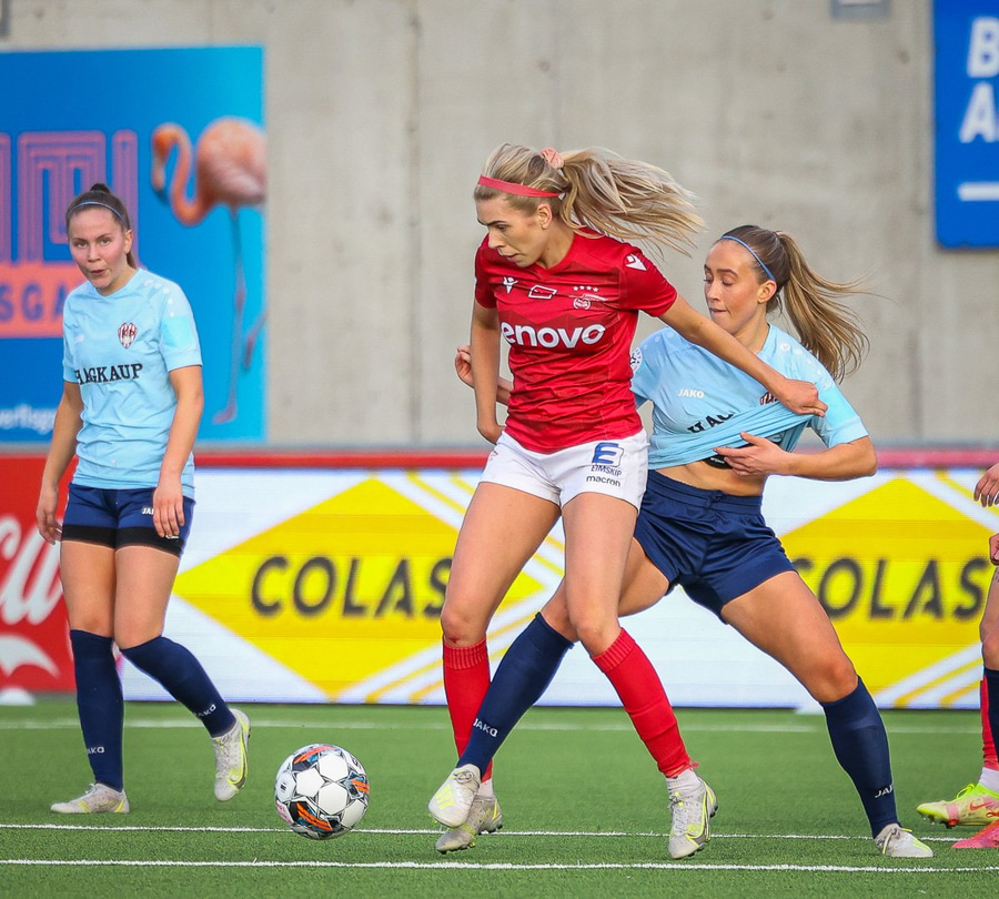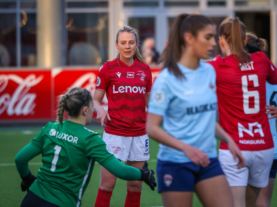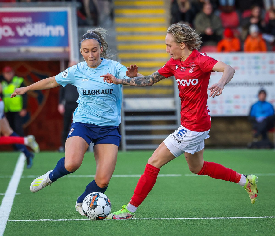 Heimakonur sparka leiknum í gang. Þær sækja í átt að Öskjuhlíðnni.