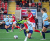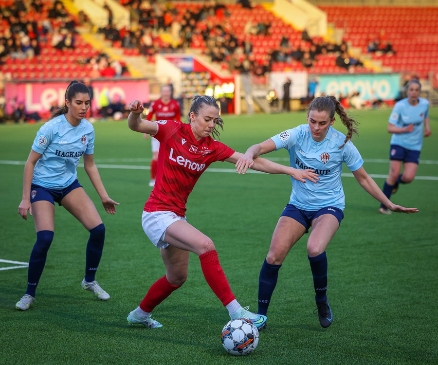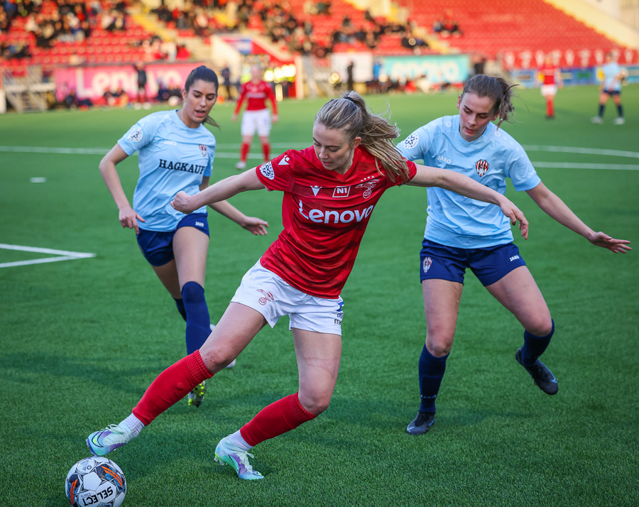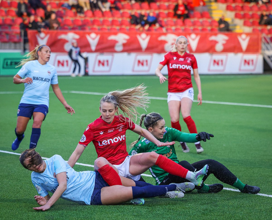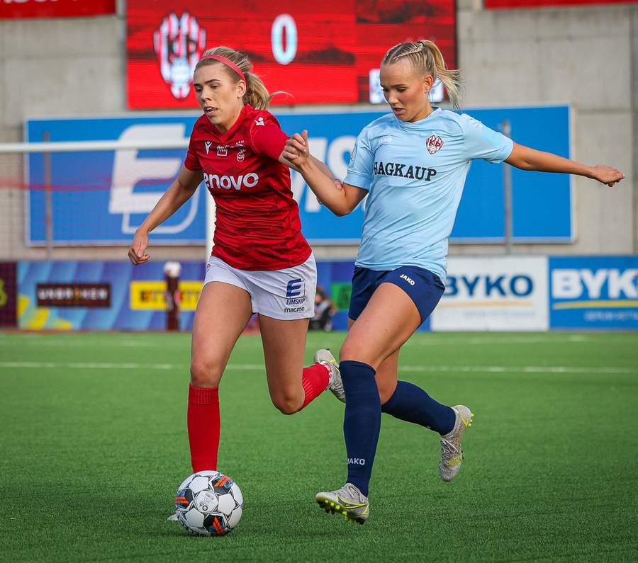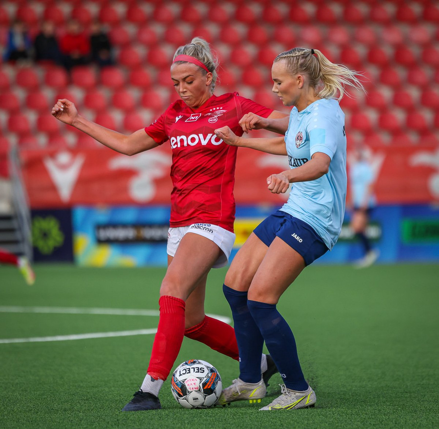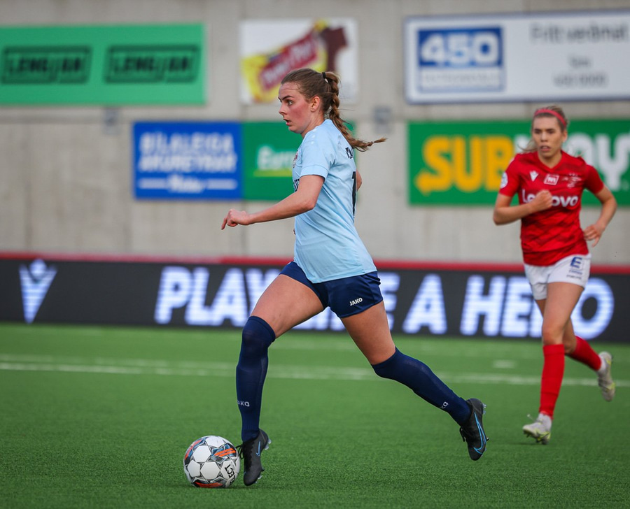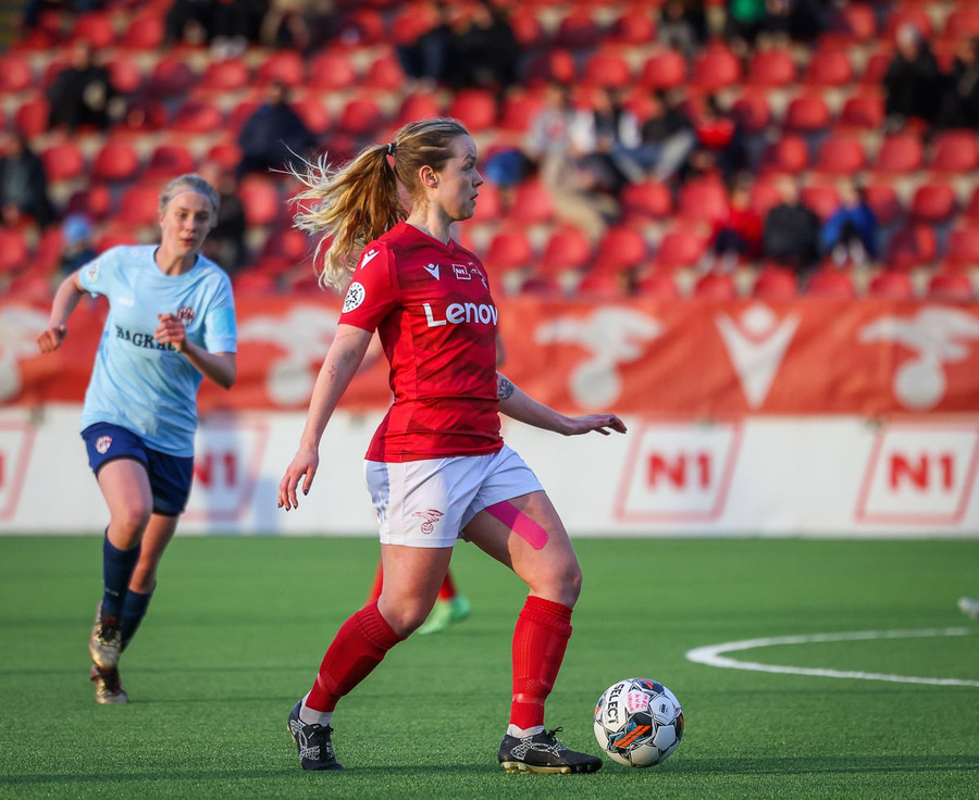 Heimakonur sparka leiknum í gang. Þær sækja í átt að Öskjuhlíðnni.