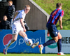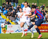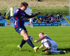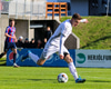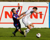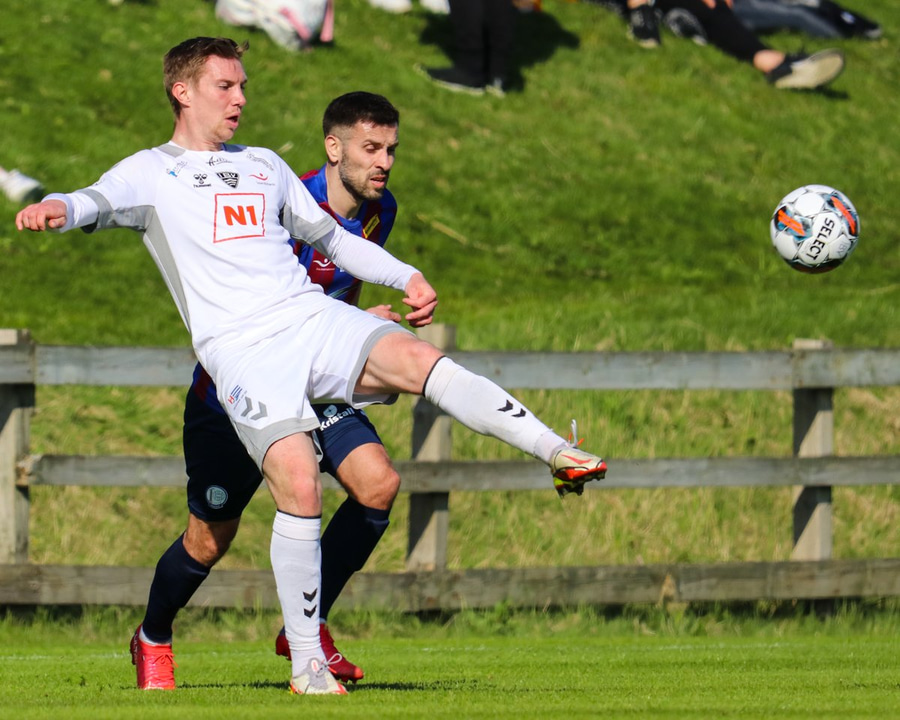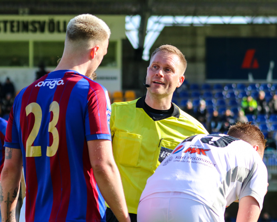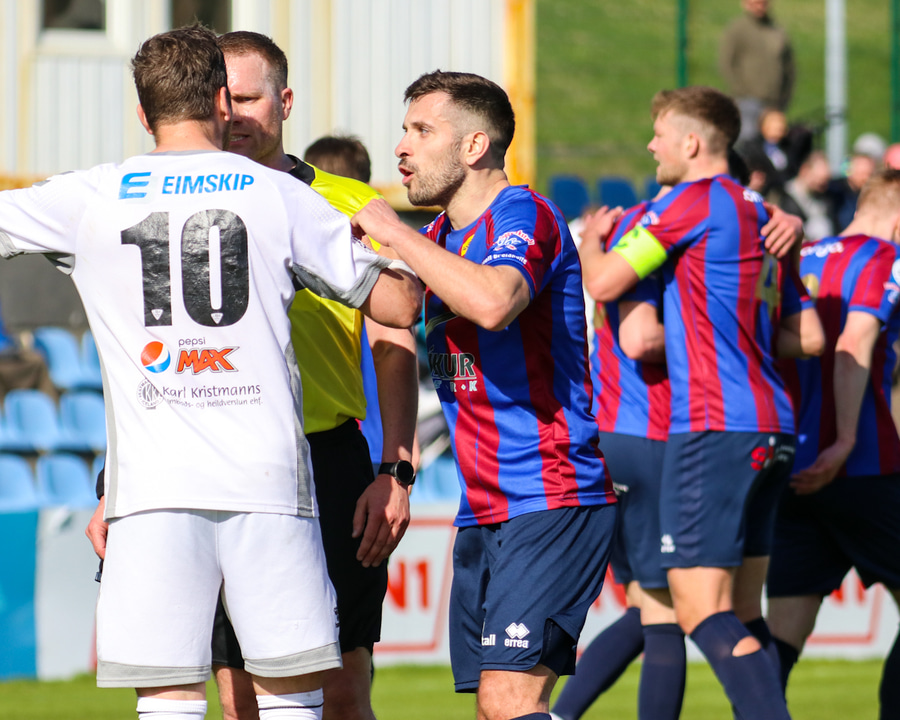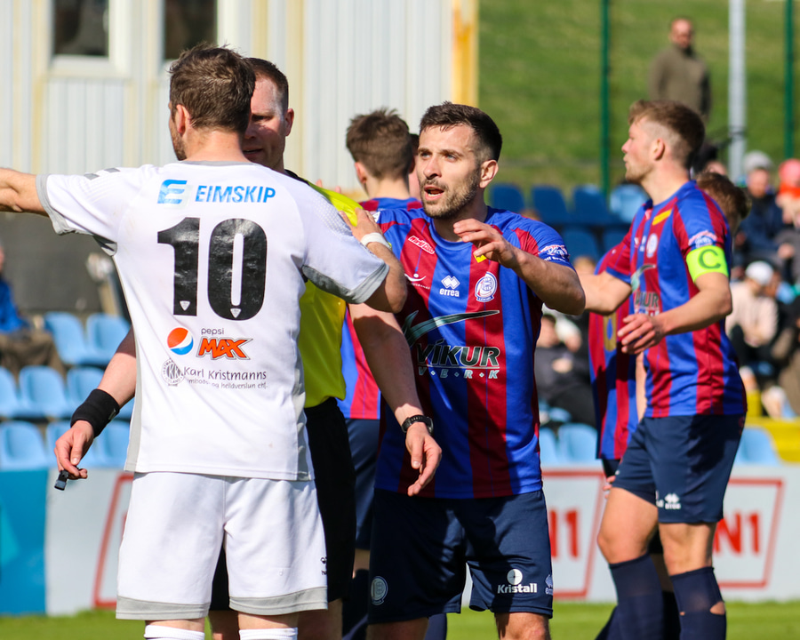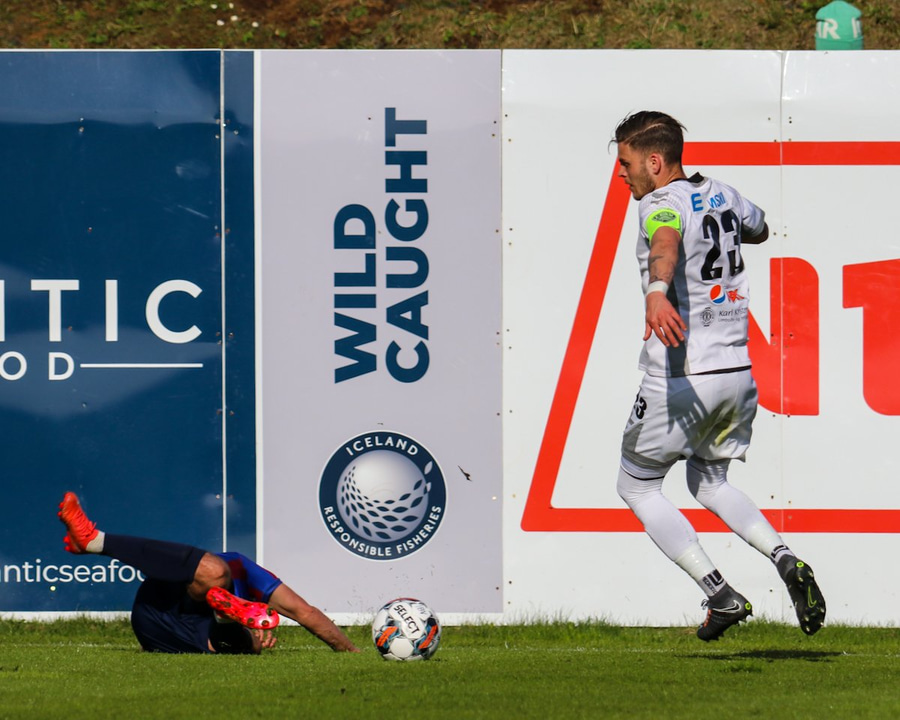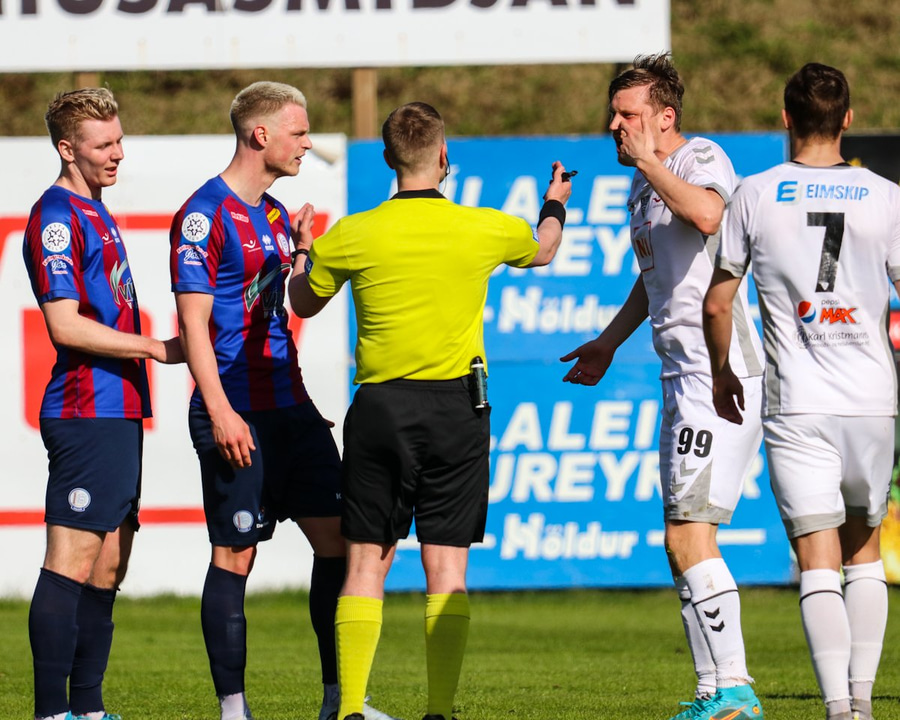 Halldór Jón Sigurður fer hér í frekar glæfralega tæklingu en sleppur með gult spjald og fær þess í stað tiltal frá dómaranum.