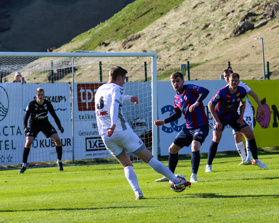 Ég var varla búinn að sleppa orðinu hér um að það væri lítið að gerast þegar Eyjamenn eiga hörku skot á markið. Viktor ver í horn.