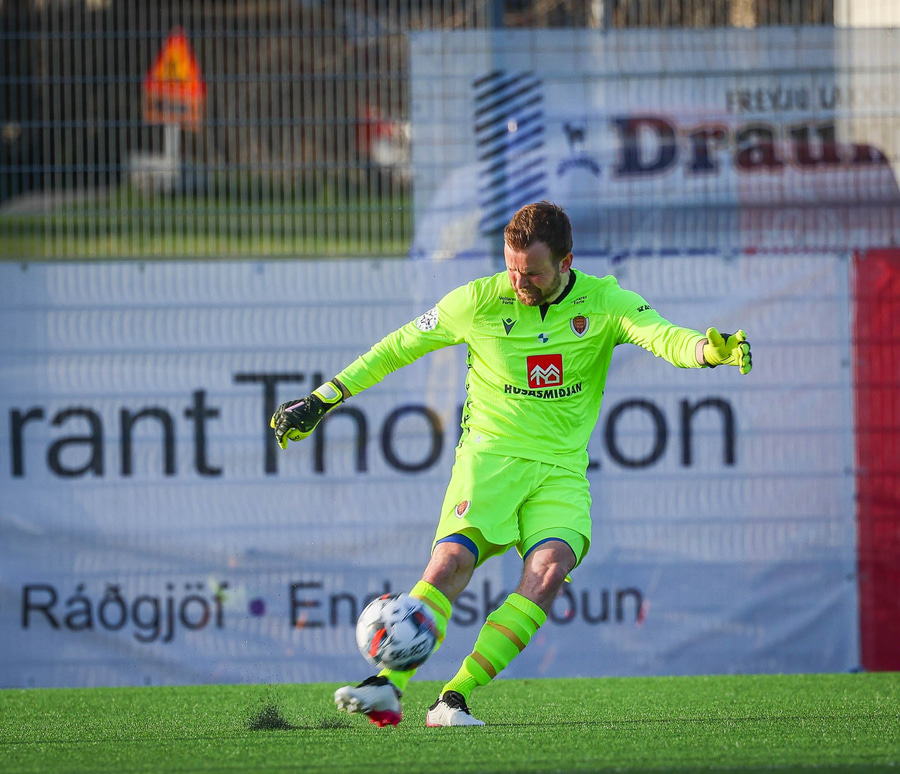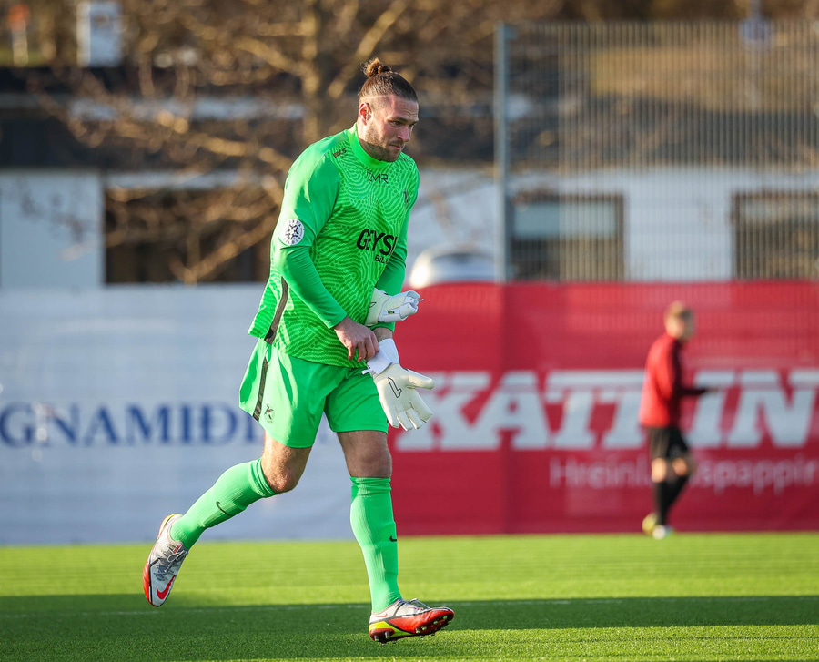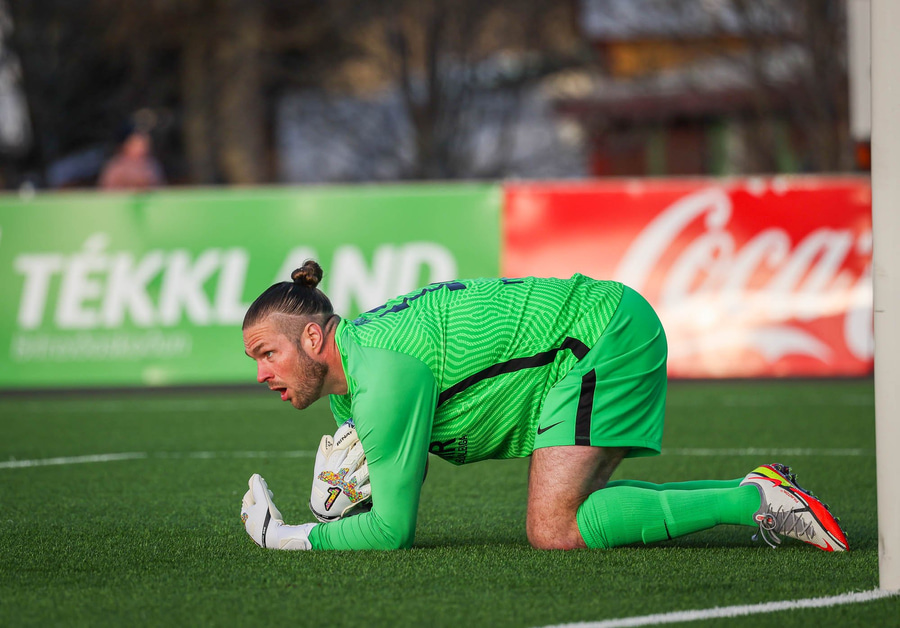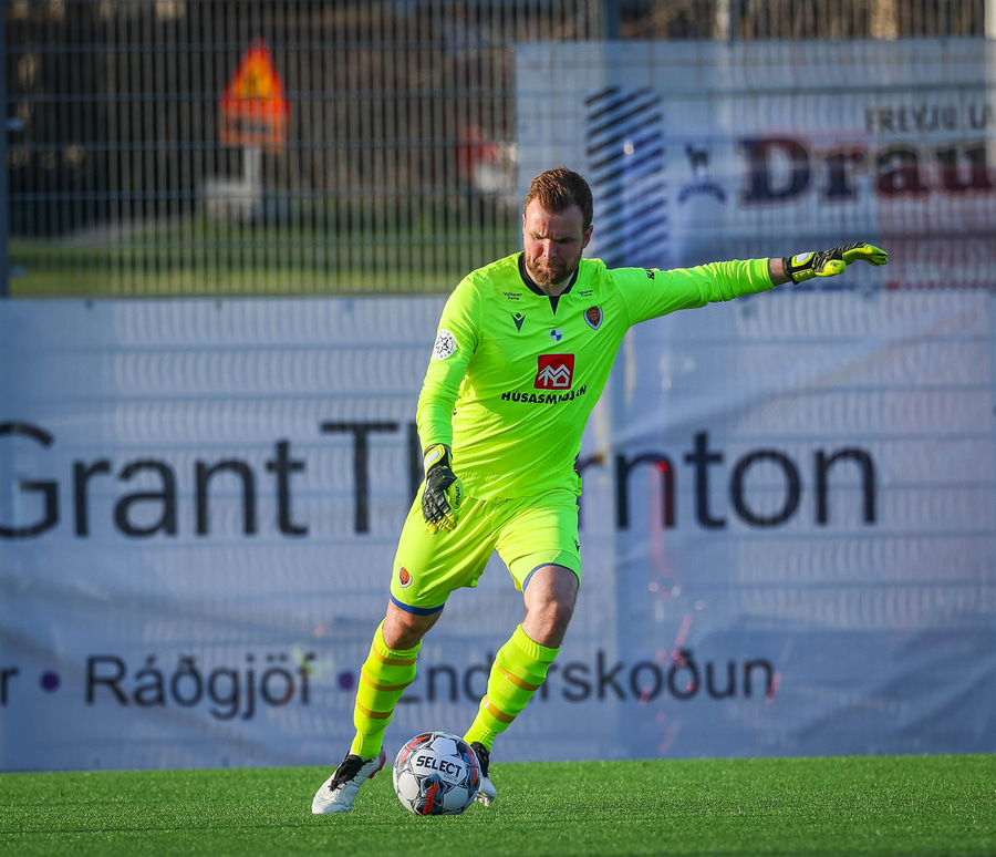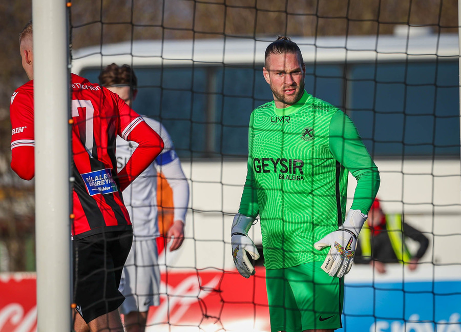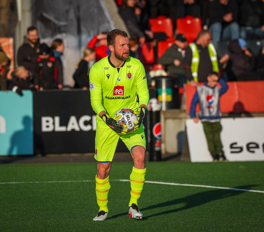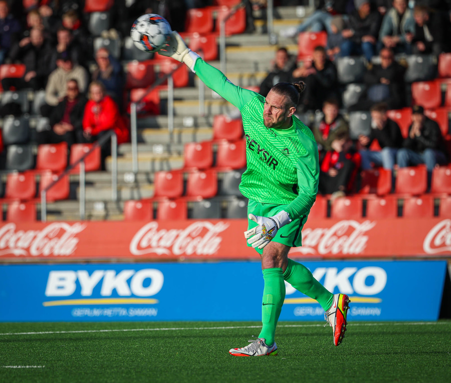 Erlingur kemst í gegn úti hægra megin, á fyrirgjöf og í kjölfarið endar boltinn í höndunum á Rúnari í marki gestanna.