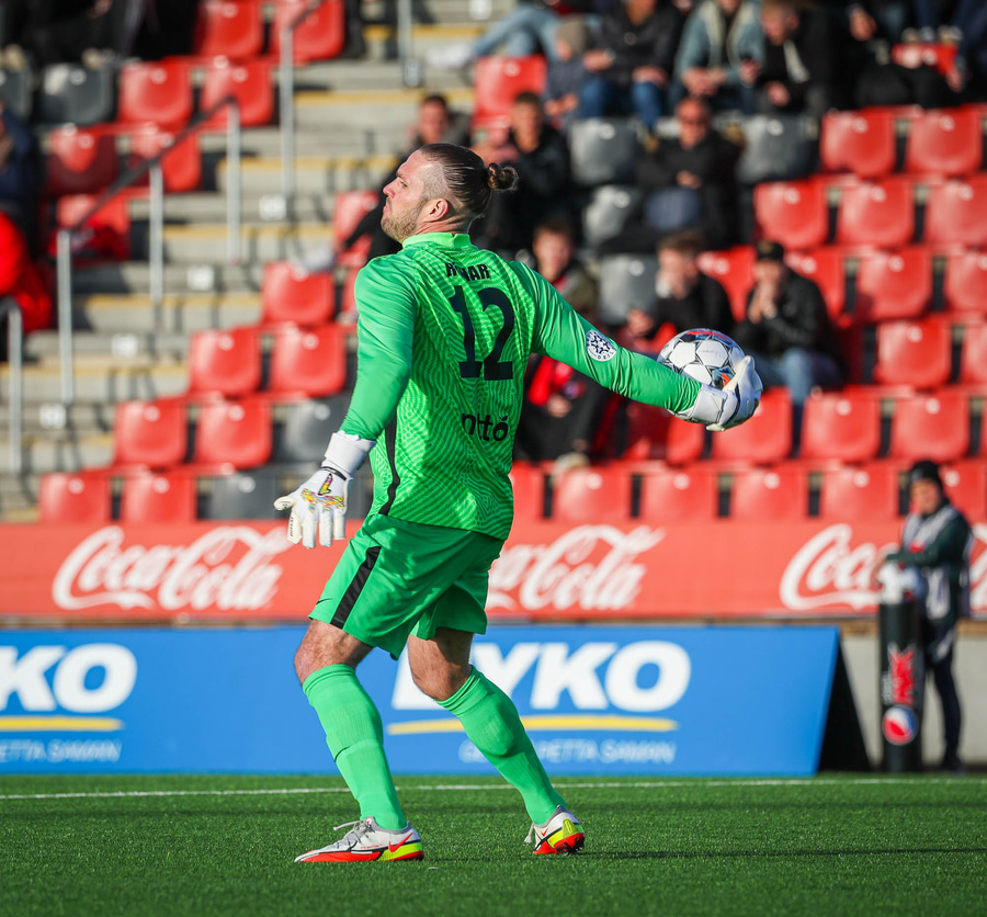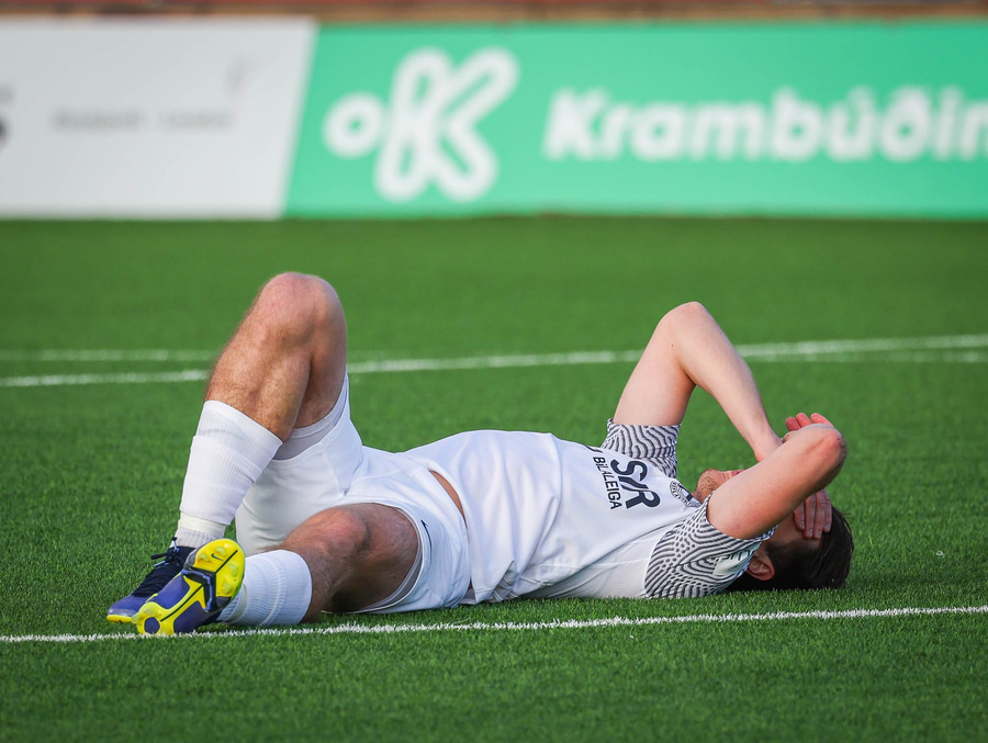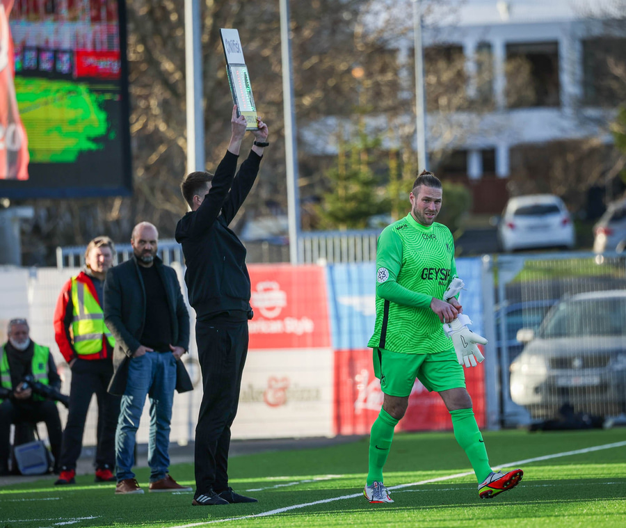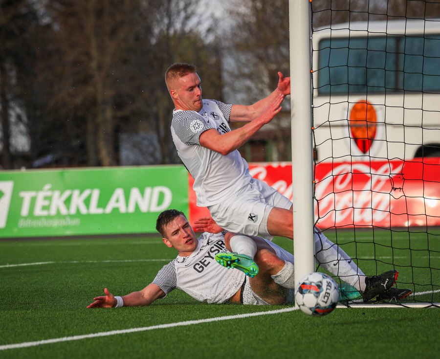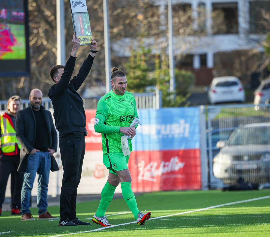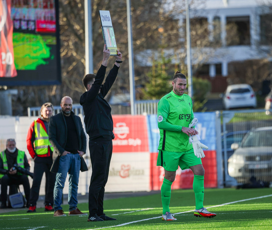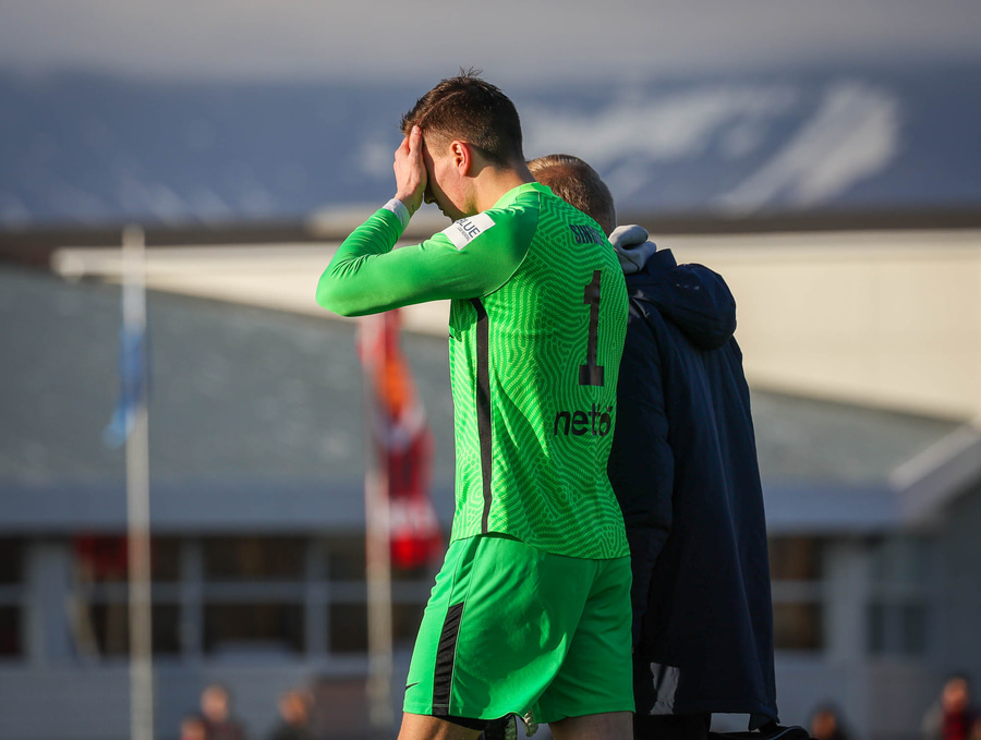 Erlingur kemst í gegn úti hægra megin, á fyrirgjöf og í kjölfarið endar boltinn í höndunum á Rúnari í marki gestanna.