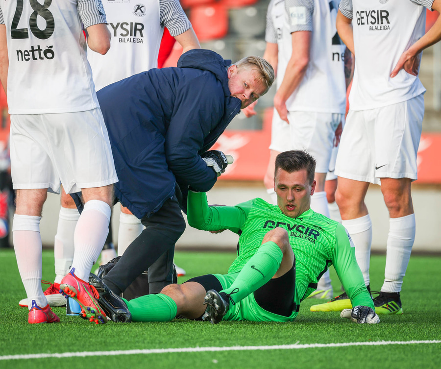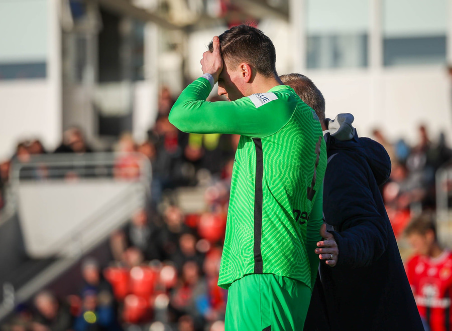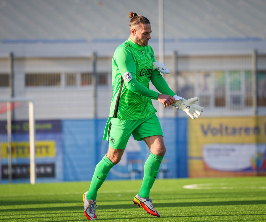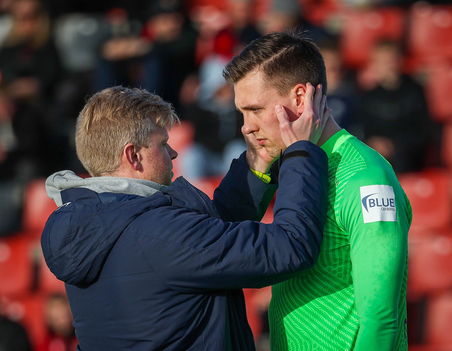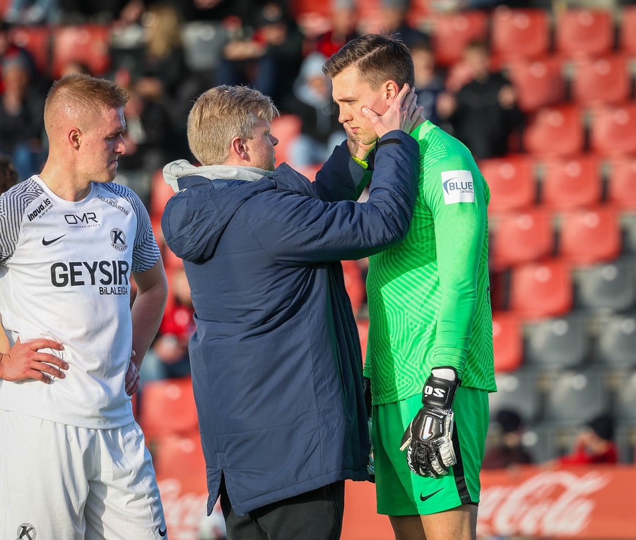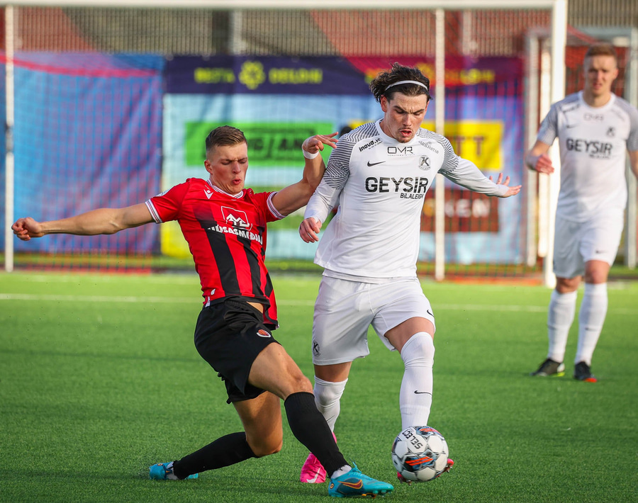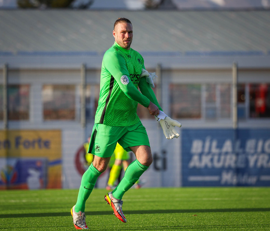 Erlingur kemst í gegn úti hægra megin, á fyrirgjöf og í kjölfarið endar boltinn í höndunum á Rúnari í marki gestanna.
