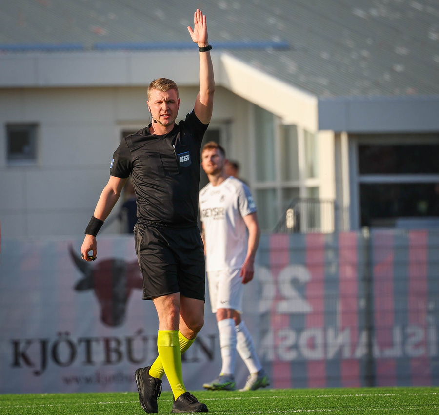 Elías Ingi Árnason heldur um flautuna í leiknum og honum til aðstoðar eru þeir Birkir Sigurðarson og Patrik Freyr Guðmundsson eru honum til aðstoðar. Vilhjálmur Alvar Þórarinsson er skiltadómari og Björn Guðbjörnsson er eftirlitsmaður KSÍ.