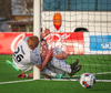Keyrir inn á teig og lætur vaða en Ingvar sér við honum.
