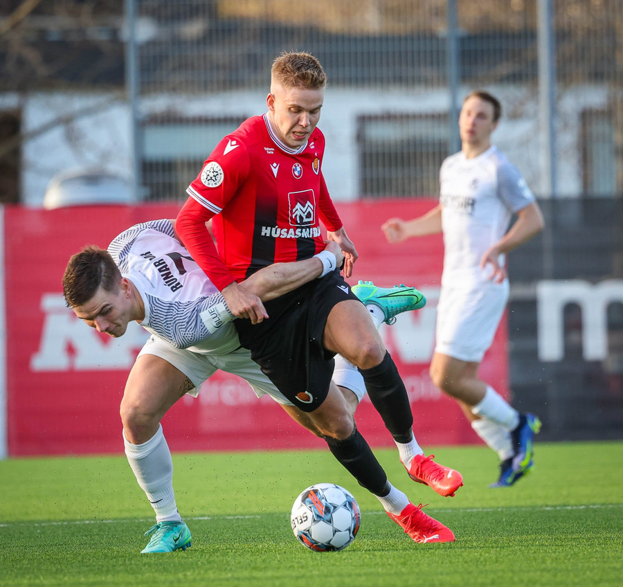 Flott spil hjá Víkingum. Karl rennir boltanum fyrir og finnur Nikolaj en Hatakka kemst fyrir skottilraunina.
