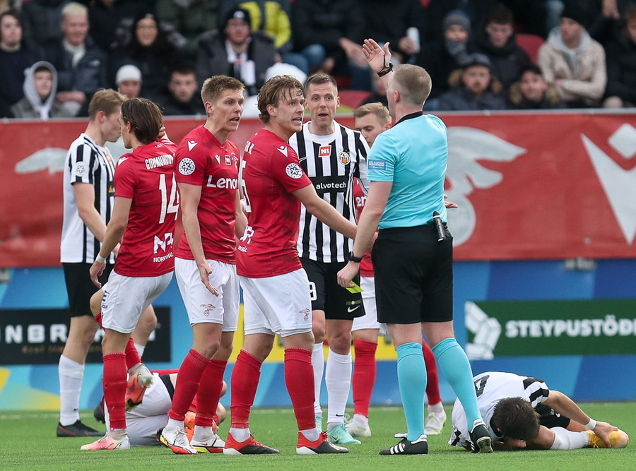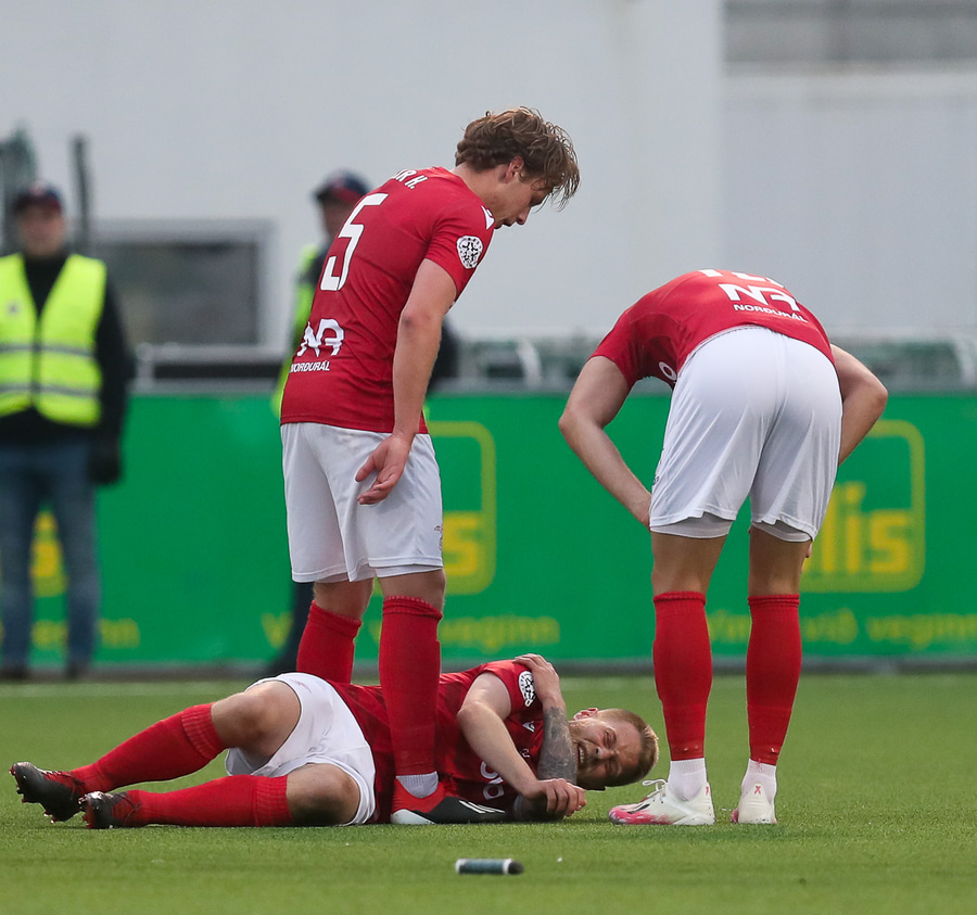 Það fer svo að Haukur Páll lætur finna fyrir sér og fer harkalega með öxlina í Theodór Elmar. Í kjölfarið verður allt vitlaust inná vellinum.
