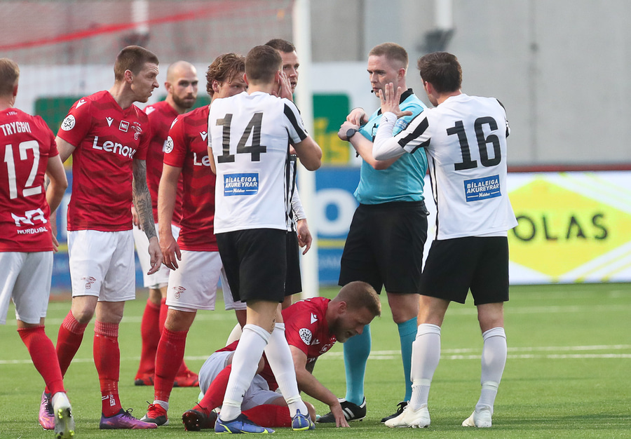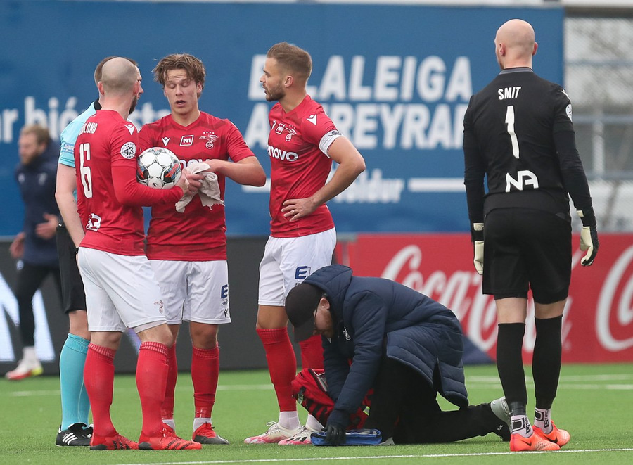 Guy Smit ætlar síðan að halda leiknum áfram eftir að hafa handsamað boltann en hleypur í bakið á Kjartani Henry sem stendur fyrir honum og leikurinn stöðvast. Það er hiti að færasta í leikanna.
