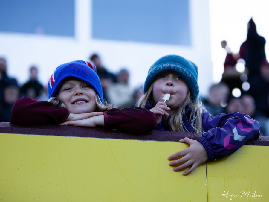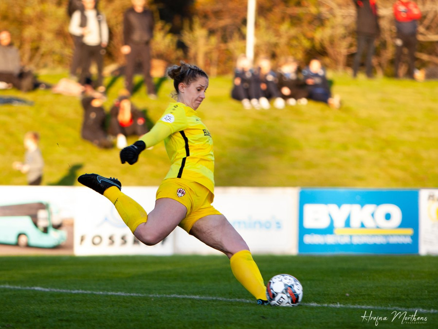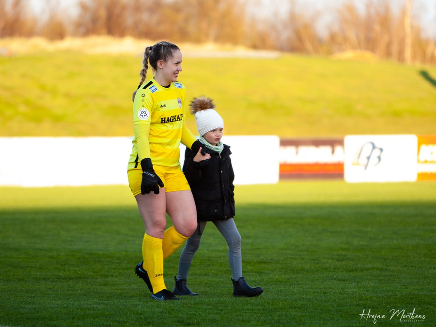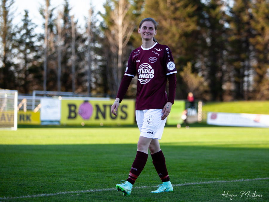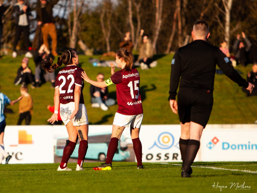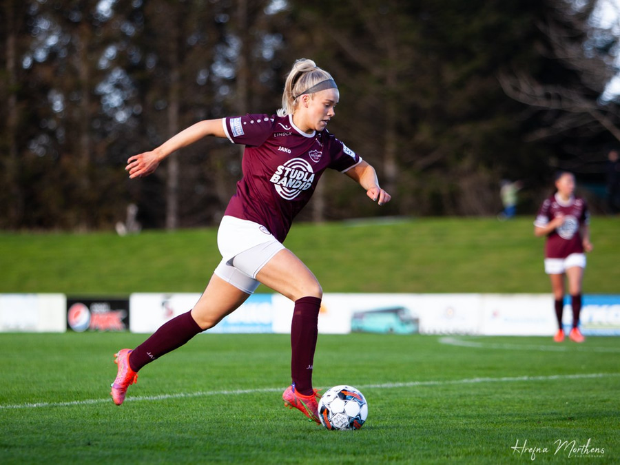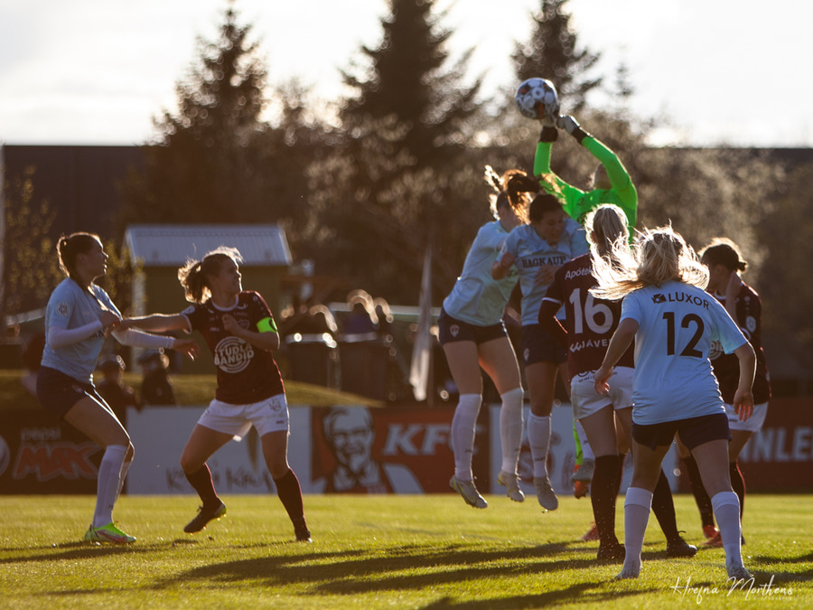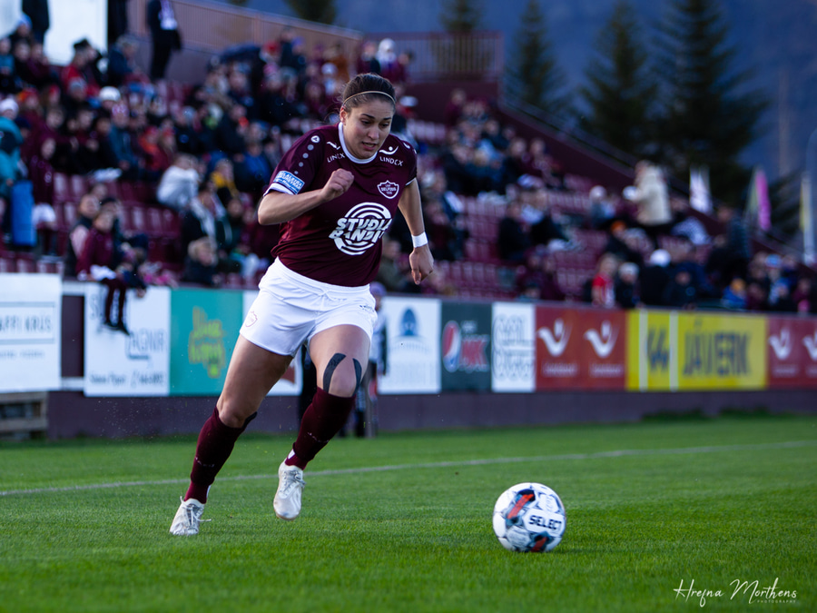 Magdalena á góða takta fyrir utan teig og kemur sér inní teiginn en Íris er á undan henni í boltann.