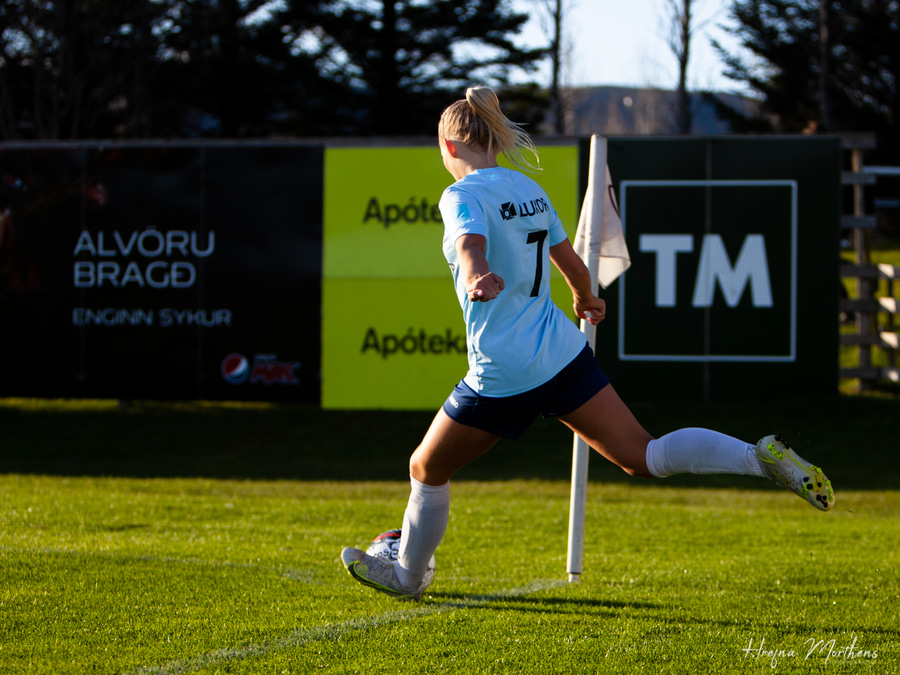 Bergrós fær boltann við endalínuna og setur boltann inní teiginn en Unnur verður fyrir sendignunni og ekkert gerist.