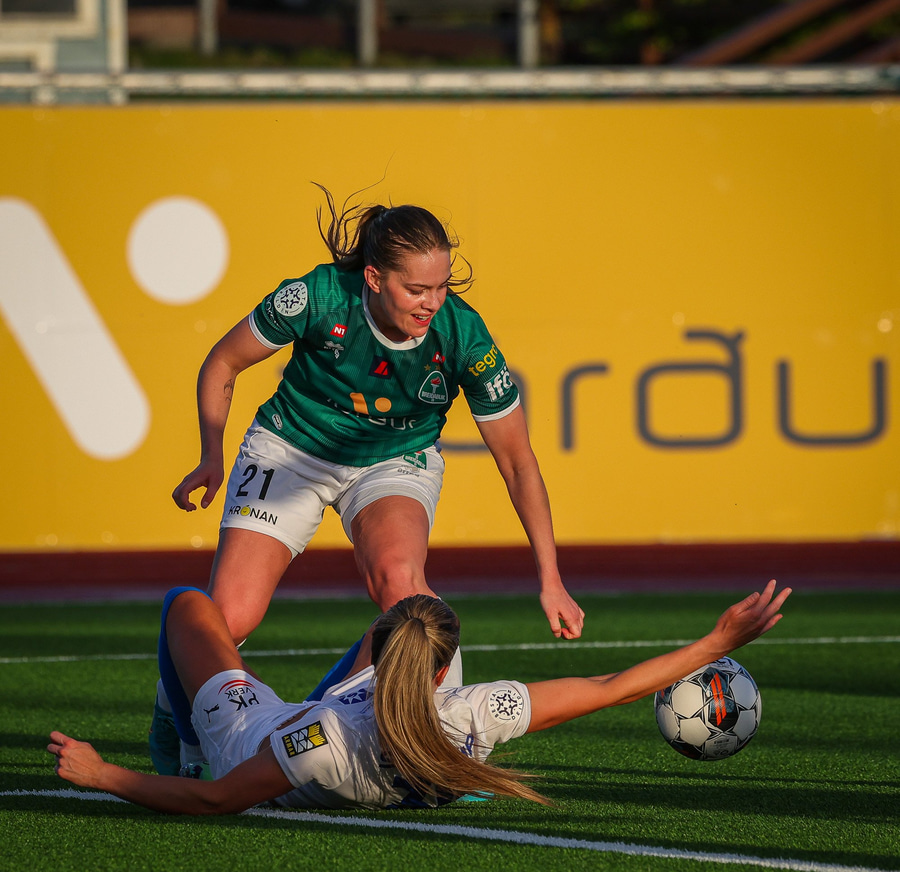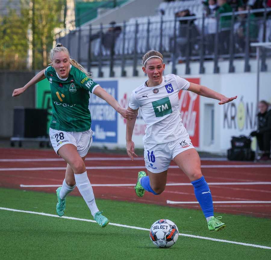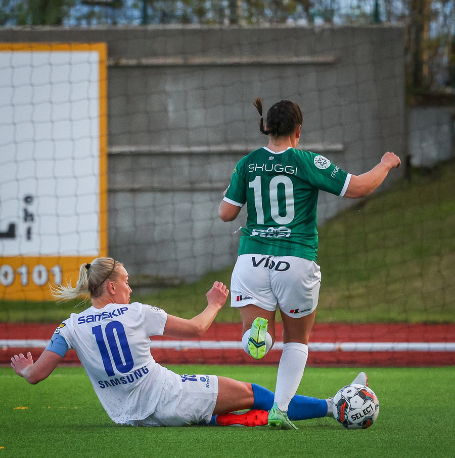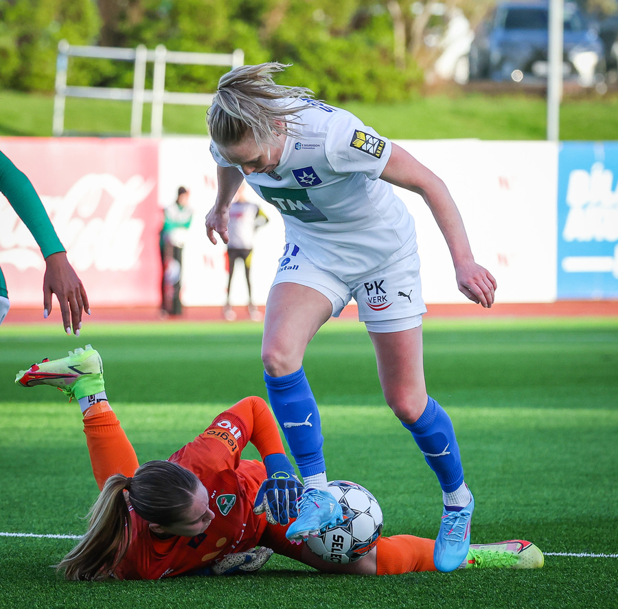 Hildigunnur á hér geggjaðan sprett og sendir fínan bolta í gegn á Jasmín sem er ein gegn Telmu sem gerir vel og lokar á hana. Þær skella hinsvegar saman og Jasmín þarf að fá aðhlynningu utanvallar en getur vonandi haldið áfram