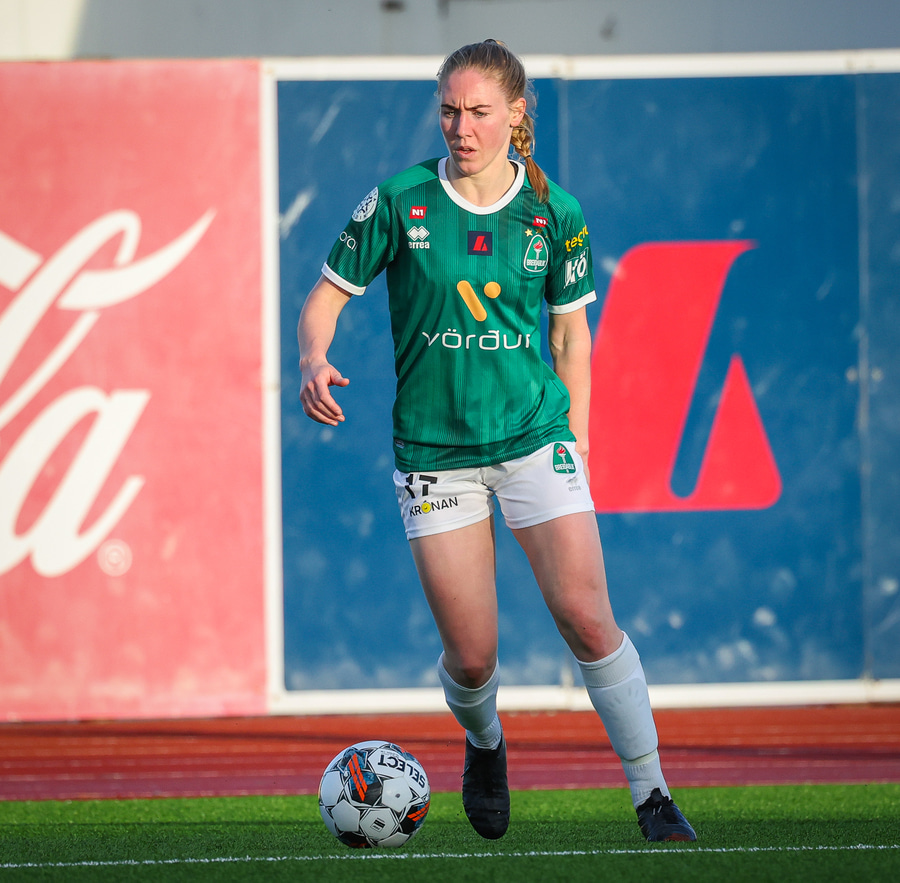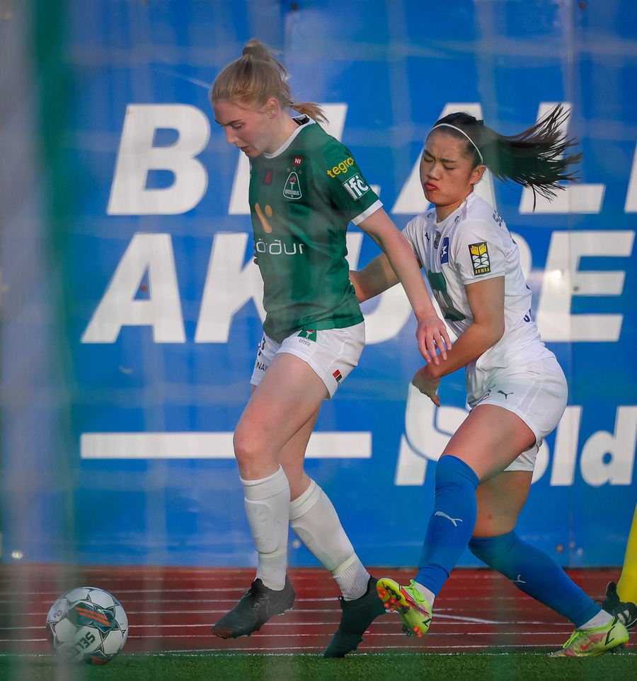 Chante fer í skógarhlaup og skot á autt markið frá Hildi fer í hendina á varnamanni.