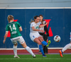 Alma Mathiesen á kraftmikin sprett upp miðjan völlin en missir boltan aðeins of langt frá sér og á mjög kröftuga tæklingu á Karítas. Alma dæmd brotlegt og heppin að sleppa við spjald.